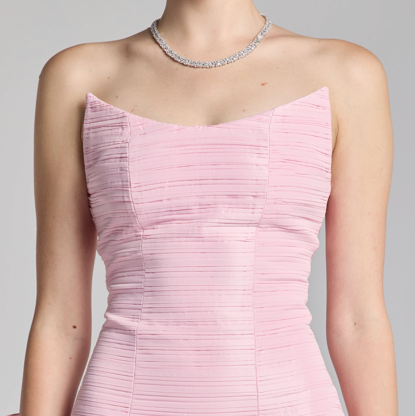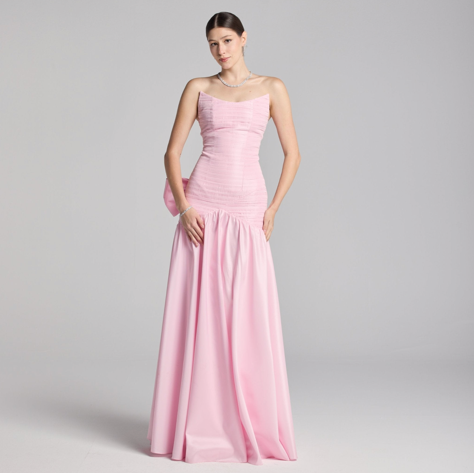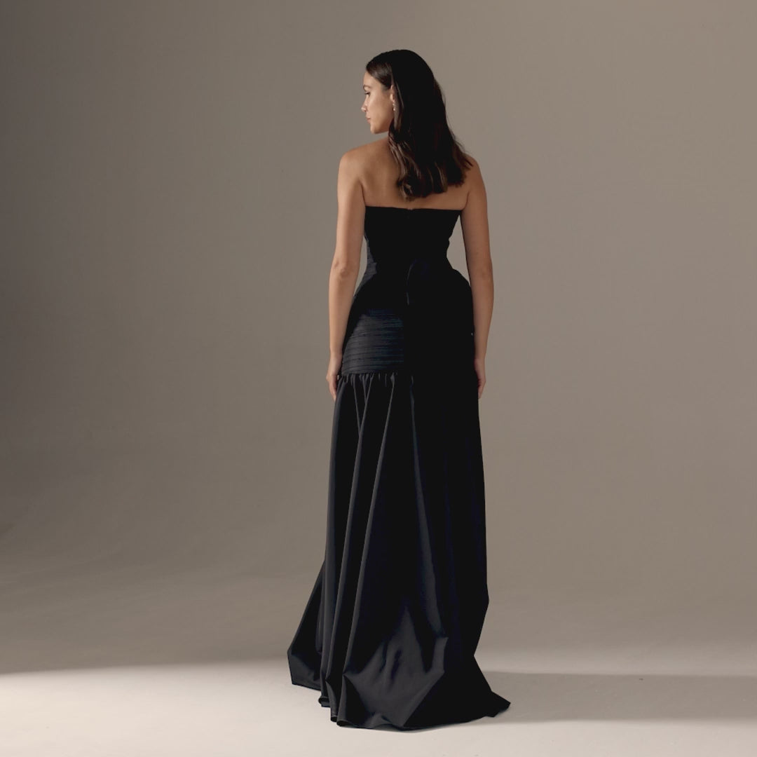 Make a bold statement in the Candelaria Gown, a strapless A-line evening dress designed to captivate. Its draped and pleated fabric flows gracefully to the floor, while the dramatic big bow at the back adds a daring touch to the backless silhouette. Perfect for prom or any party where you want to stand out with elegance and confidence.