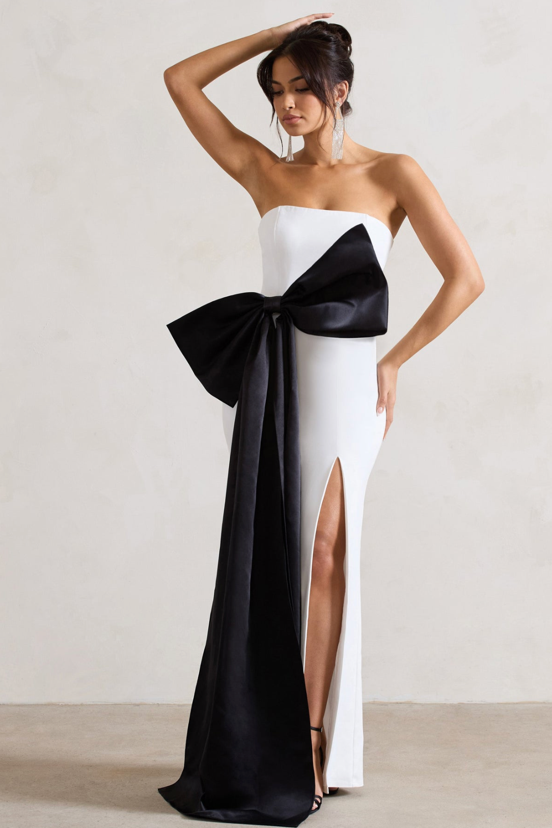Step into the spotlight with the Russey Gown. This bold strapless dress, available in black or pink, showcases a dramatic oversized bow and a daring side slit. Its sleeveless cut exudes confidence and elegance, ideal for making an unforgettable impression at prom or any party.