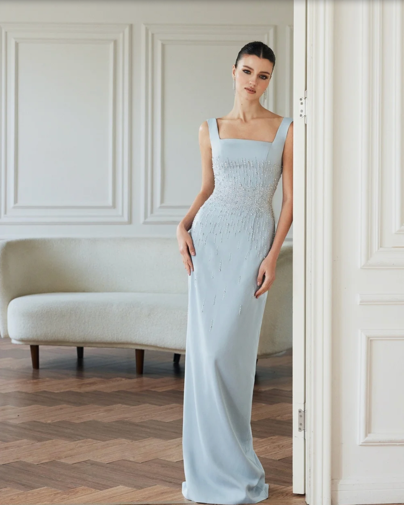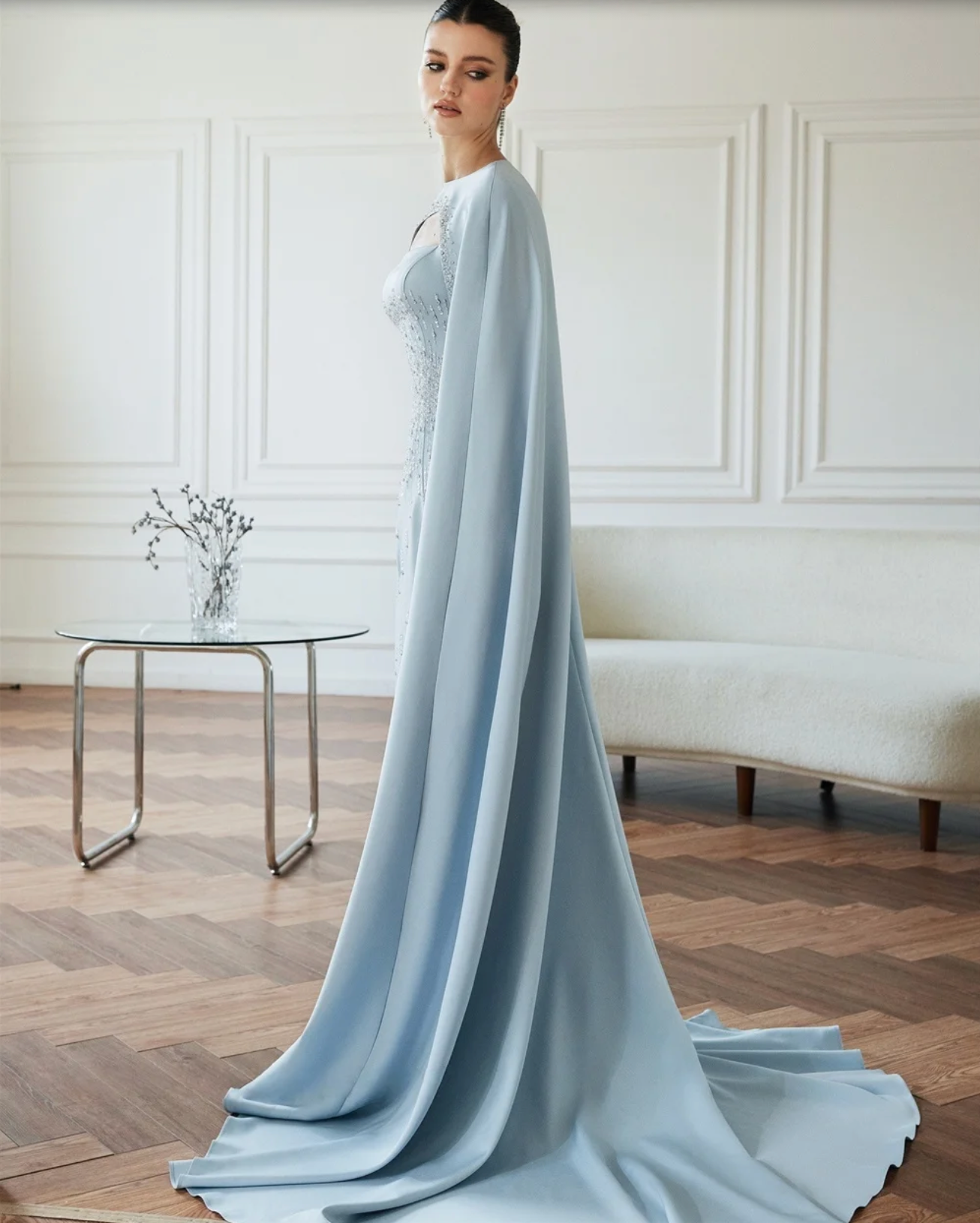 Dare to make an entrance in this striking pale blue gown, where elegance meets theatrical drama. The customized square neckline frames your shoulders with confidence. The Wave's intricate beading and pearl detailing catch every light as you move. The showstopping detachable cape transforms your look from refined to breathtaking—wear it flowing behind you for maximum impact or remove it for a sleek silhouette.