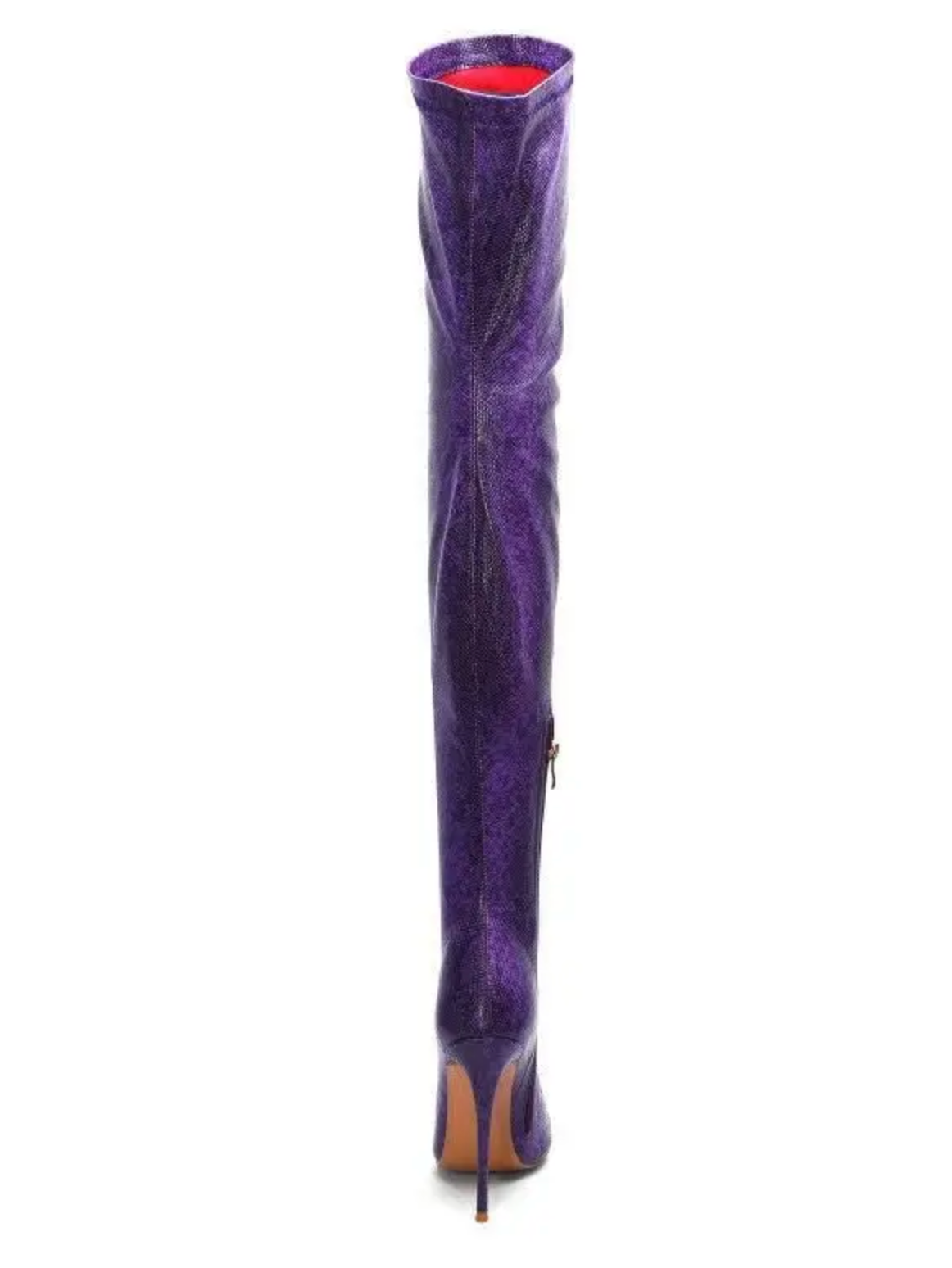 Indulge in luxury with Metropole Stiletto Heels. Crafted from snakeskin, these over-the-knee boots elevate your style and elongate your legs. The trendy embossing and thin heels add sophistication, while the fur lining keeps you warm in the winter.