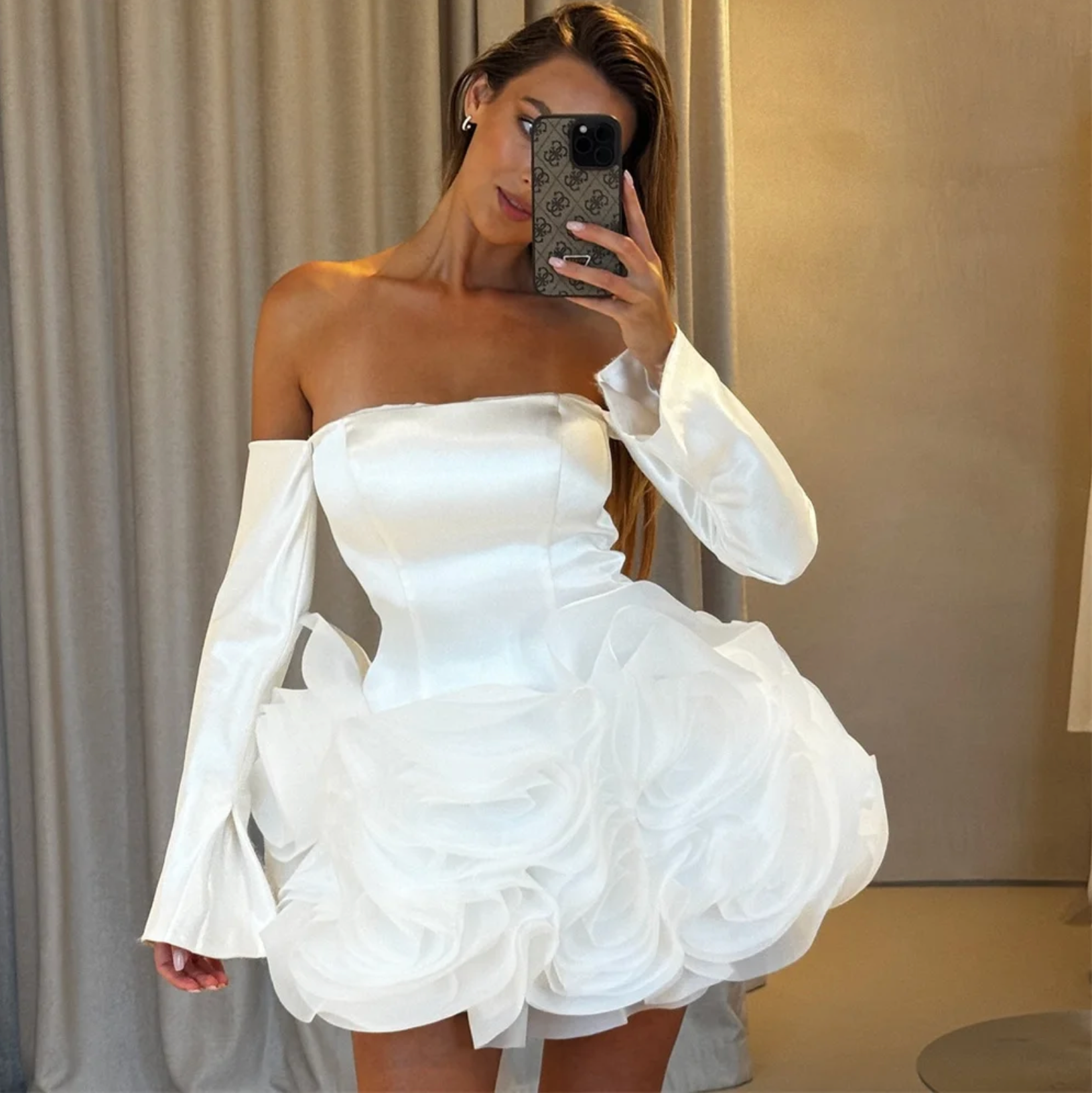 Embrace bold elegance with the Charms of Serdar Mini. A daring strapless design crafted from luxurious satin, polyester, and delicate organza. Featuring long sleeves adorned with floral details and a chic above-the-knee length, this boho-inspired dress blends beachy freedom with sophisticated charm. The zipper closure ensures a perfect fit, making it ideal for the woman who wants to stand out with confidence and style on their special day.