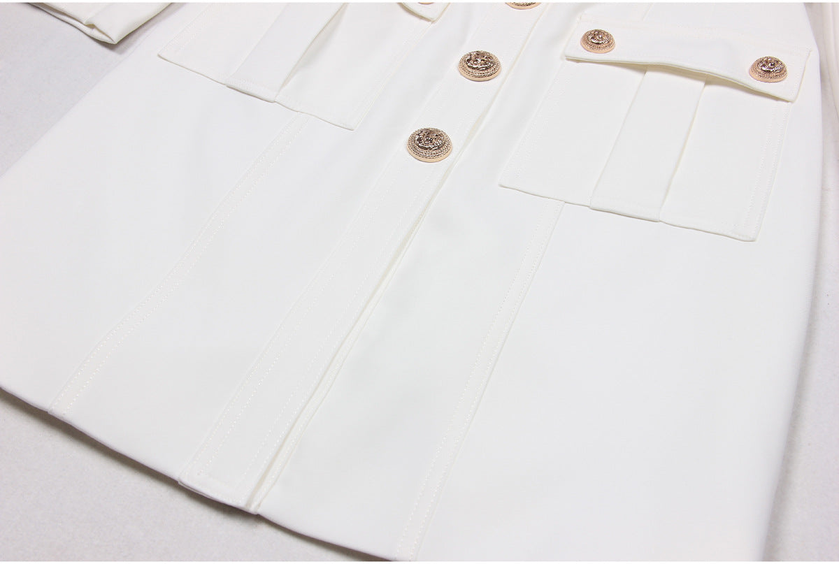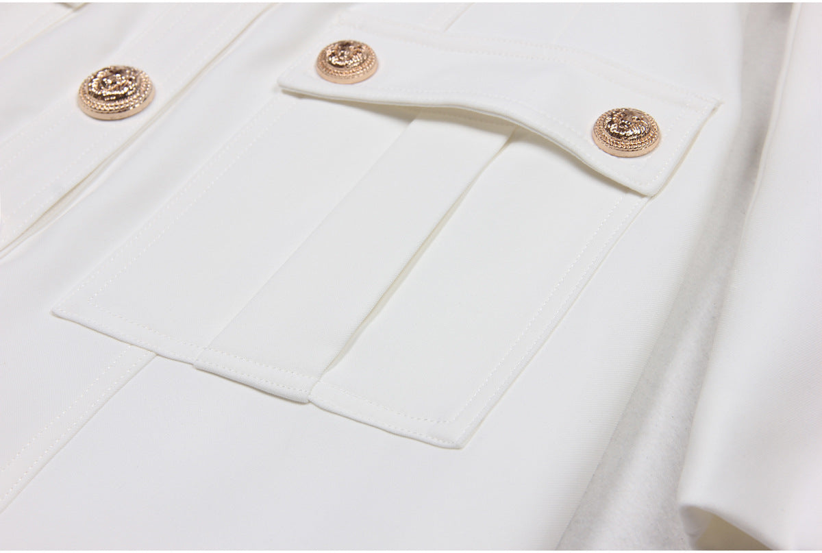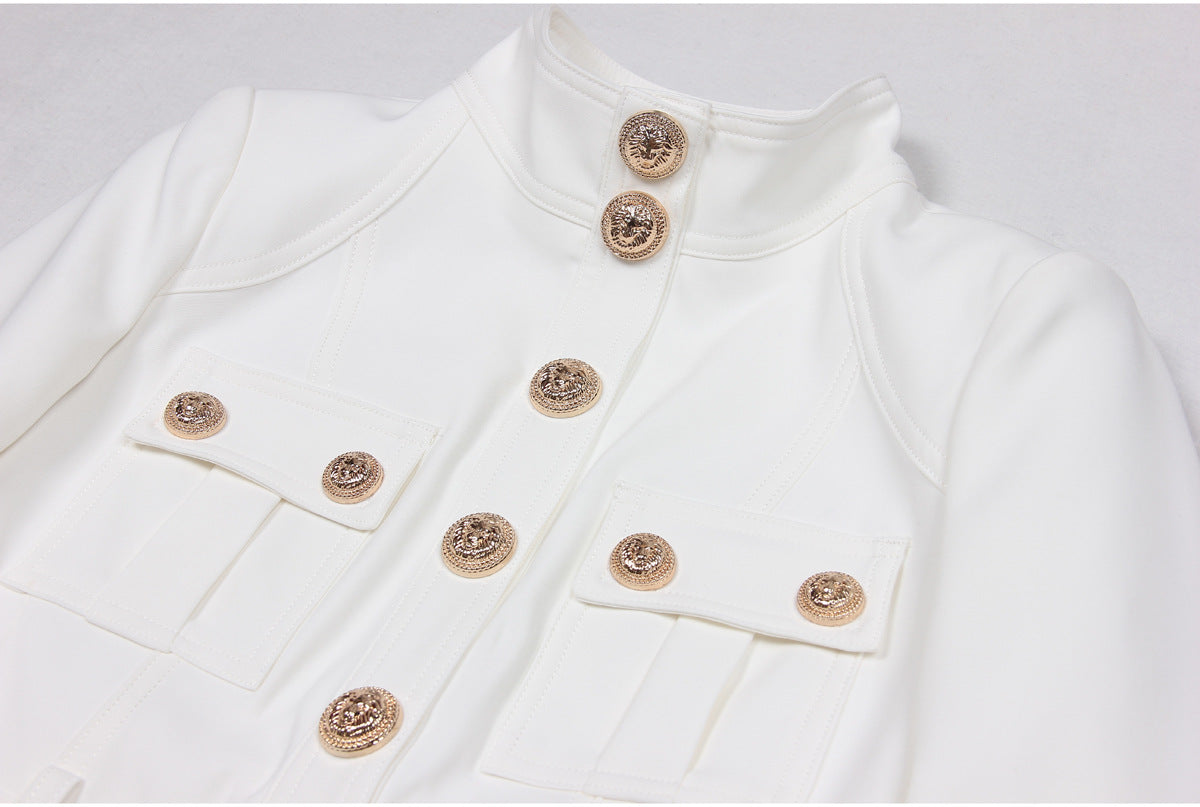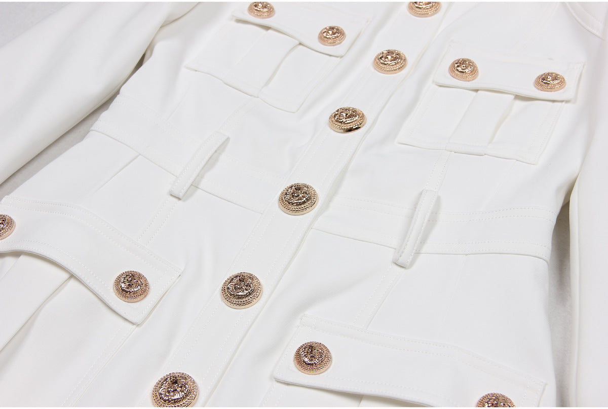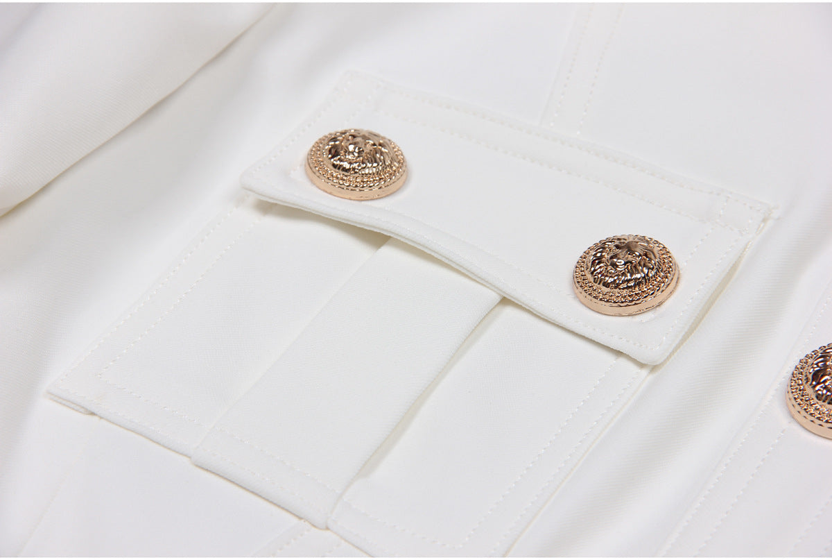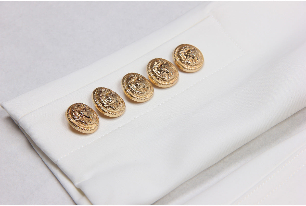Introducing our exquisite Lion Head Peacoat a true embodiment of elegance and sophistication. Crafted from a luxurious wool blend, this black coat exudes timeless charm and unparalleled comfort. Adorned with meticulously crafted gold ornate buttons throughout the front, it effortlessly combines functionality with style, making it a must-have addition to any discerning fashionista's wardrobe. Step out in confidence and grace with this remarkable peacoat that seamlessly complements any ensemble.