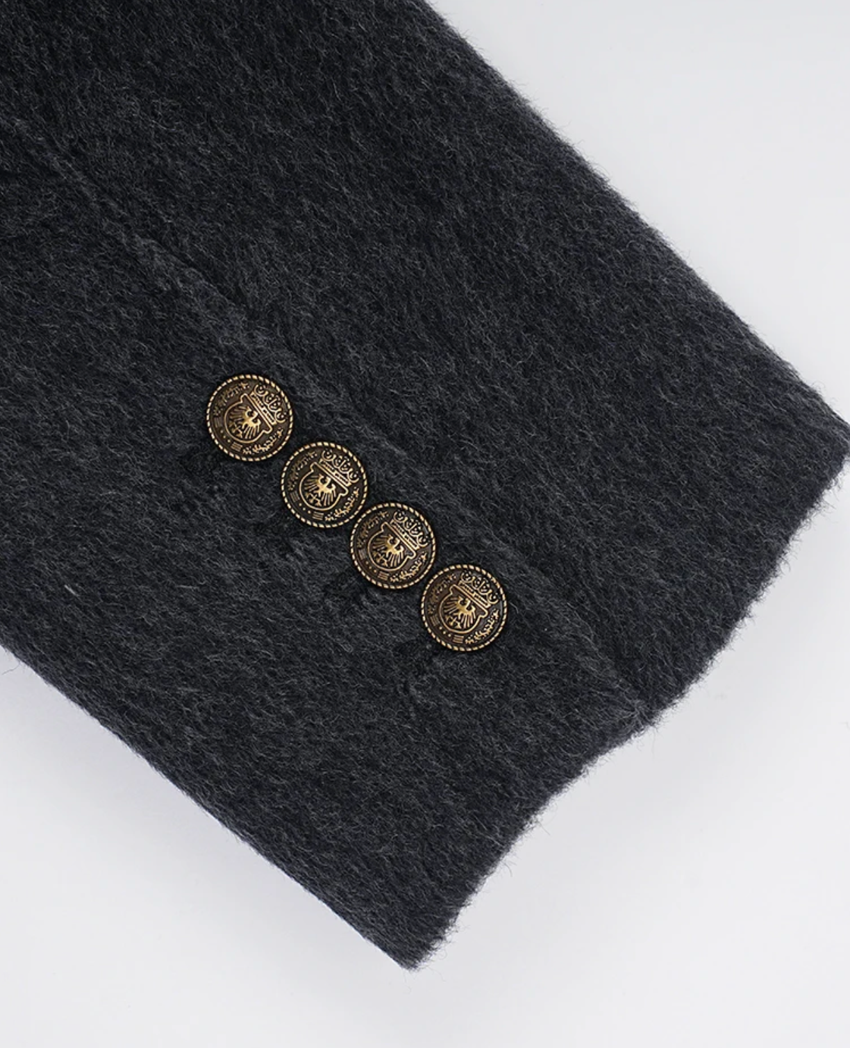 - Gold ornate buttons throughout