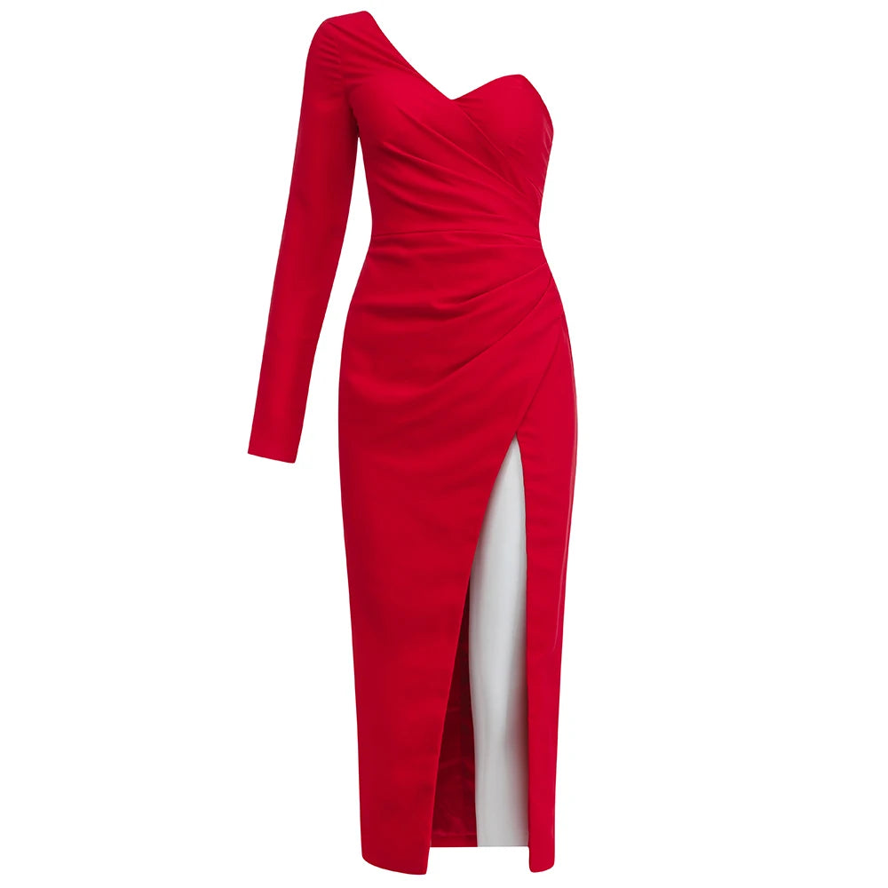 Elevate your style with our One Shoulder Sexy Maxi. Featuring a sexy V-neck and long sleeves, this bandage dress is designed to make a statement. Perfect for any special occasion, our dress exudes elegance and sophistication, making you the center of attention wherever you go. Embrace luxury with every step in this must-have fashion piece.