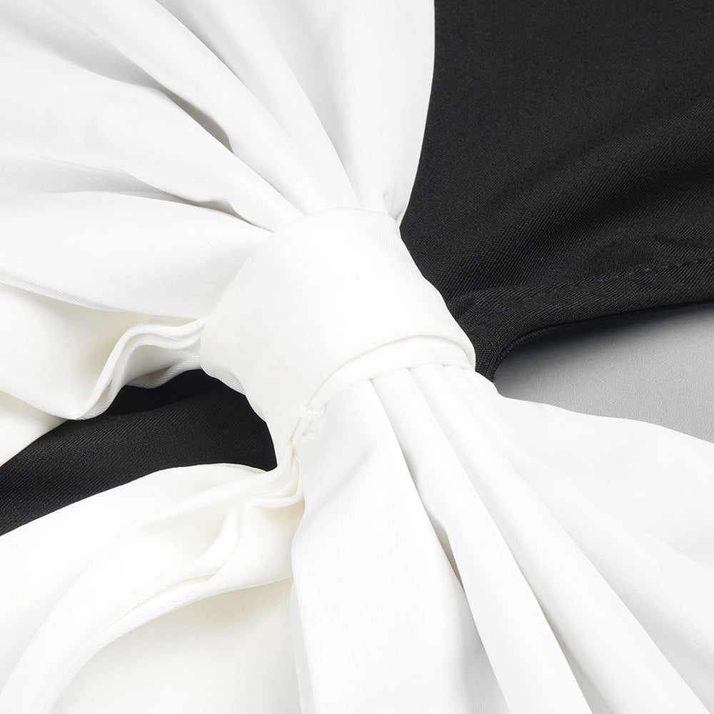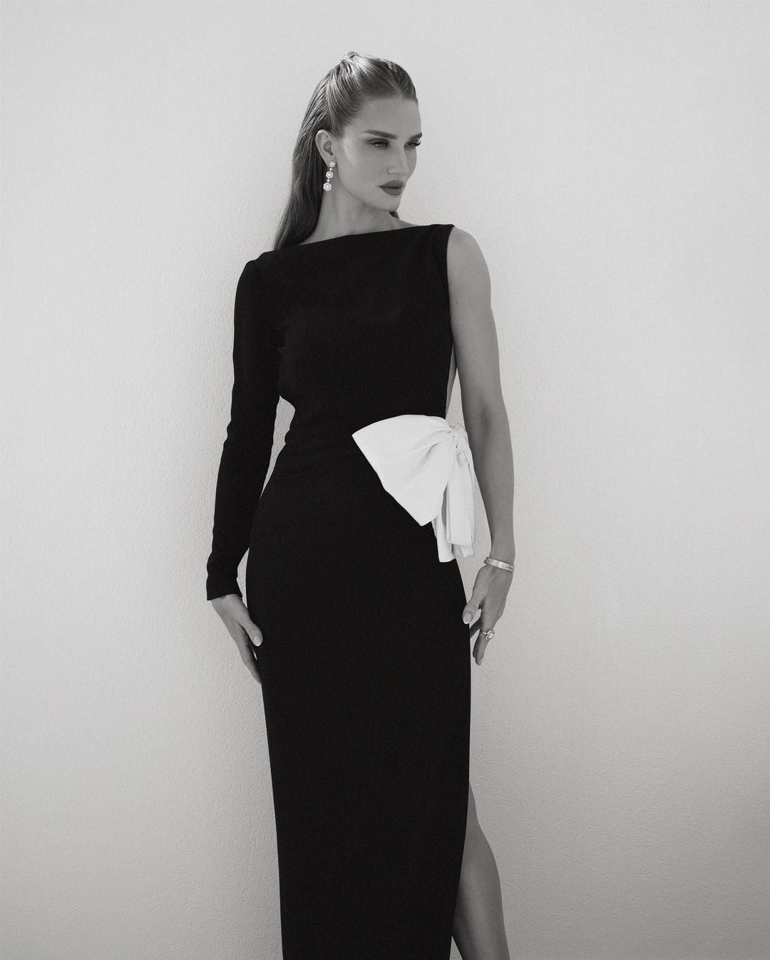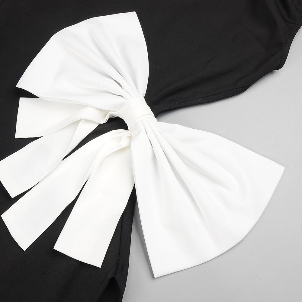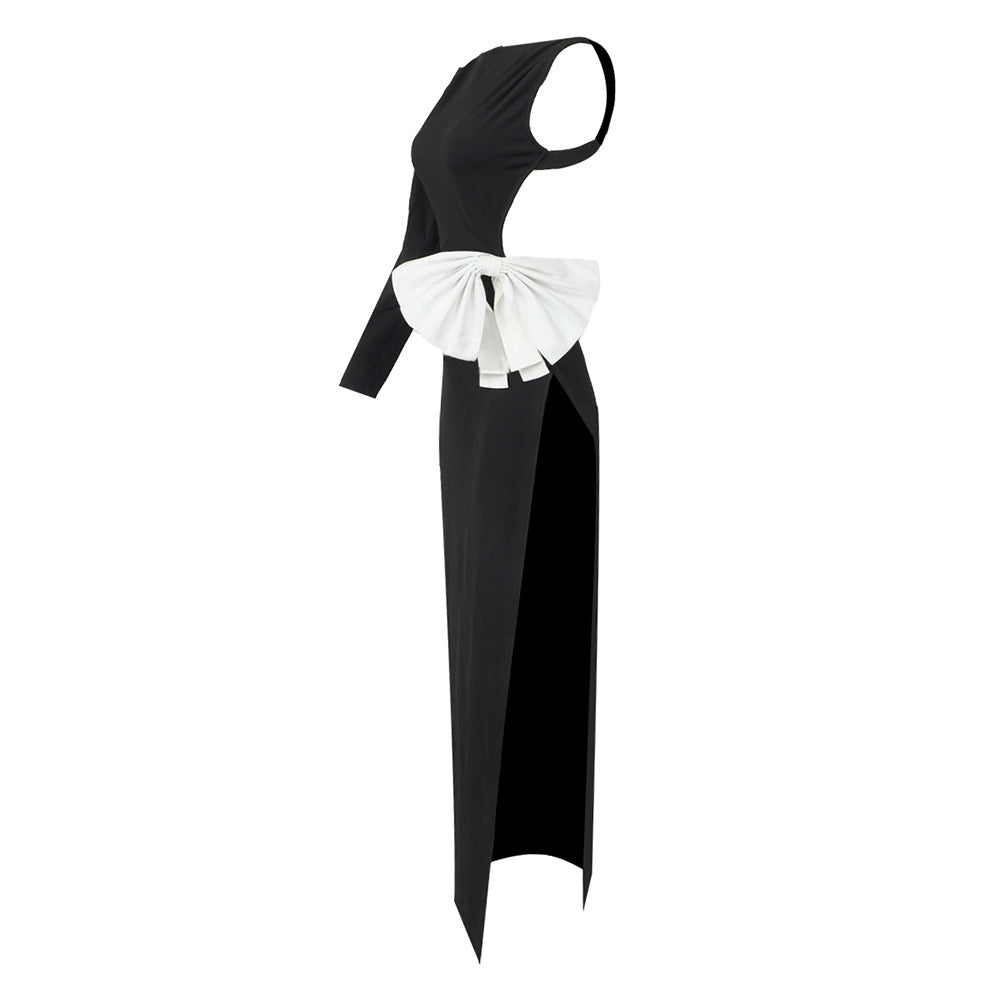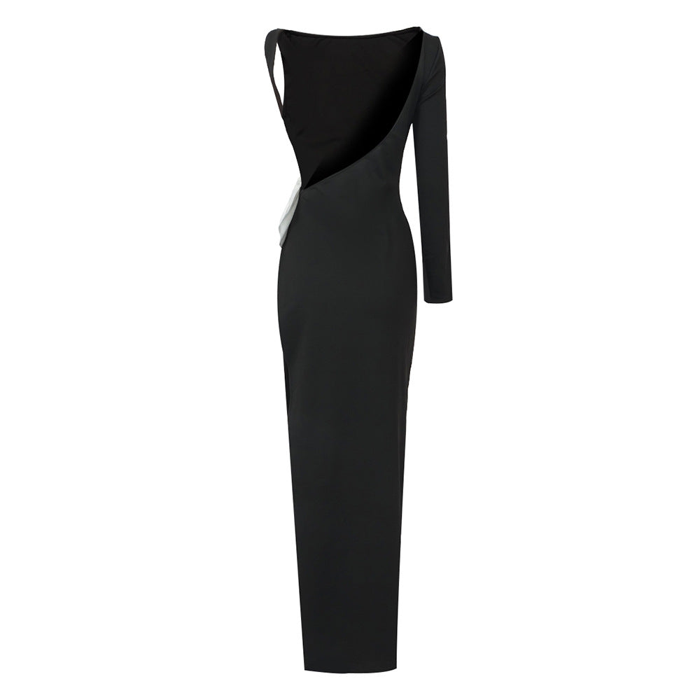 Elevate your style with this stunning black one-shoulder long sleeve Catch and Release Maxi dress featuring a white bow detail, perfect for any formal occasion. The oblique shoulder design adds a touch of sexiness, while the slit enhances the slim fit silhouette, making it a must-have piece for your wardrobe. Ideal for women who want to make a statement and turn heads wherever they go.