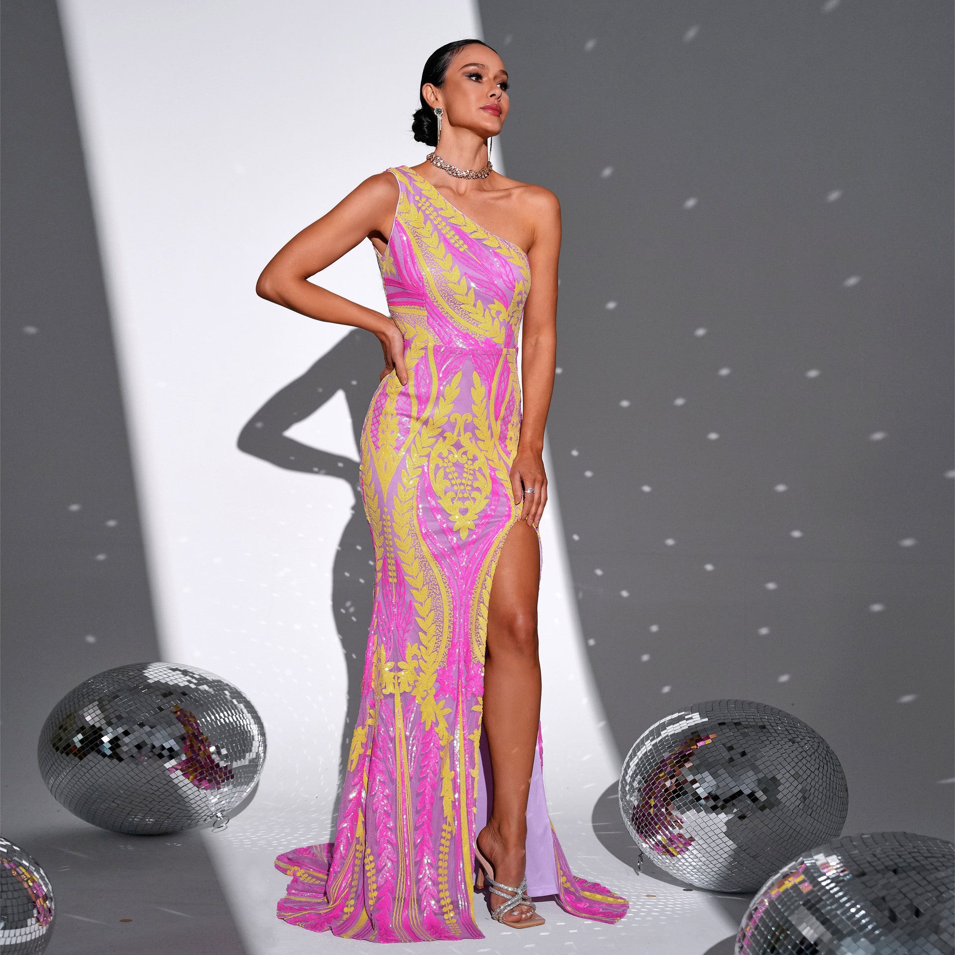 Our Pretty In Pink Evening Dress will make you the star of any event. With its stunning sequins and unique one-shoulder design, you'll feel elegant and sexy. Perfect for bridesmaids or any special occasion. (And the sleeveless style will keep you cool while you dance the night away!)