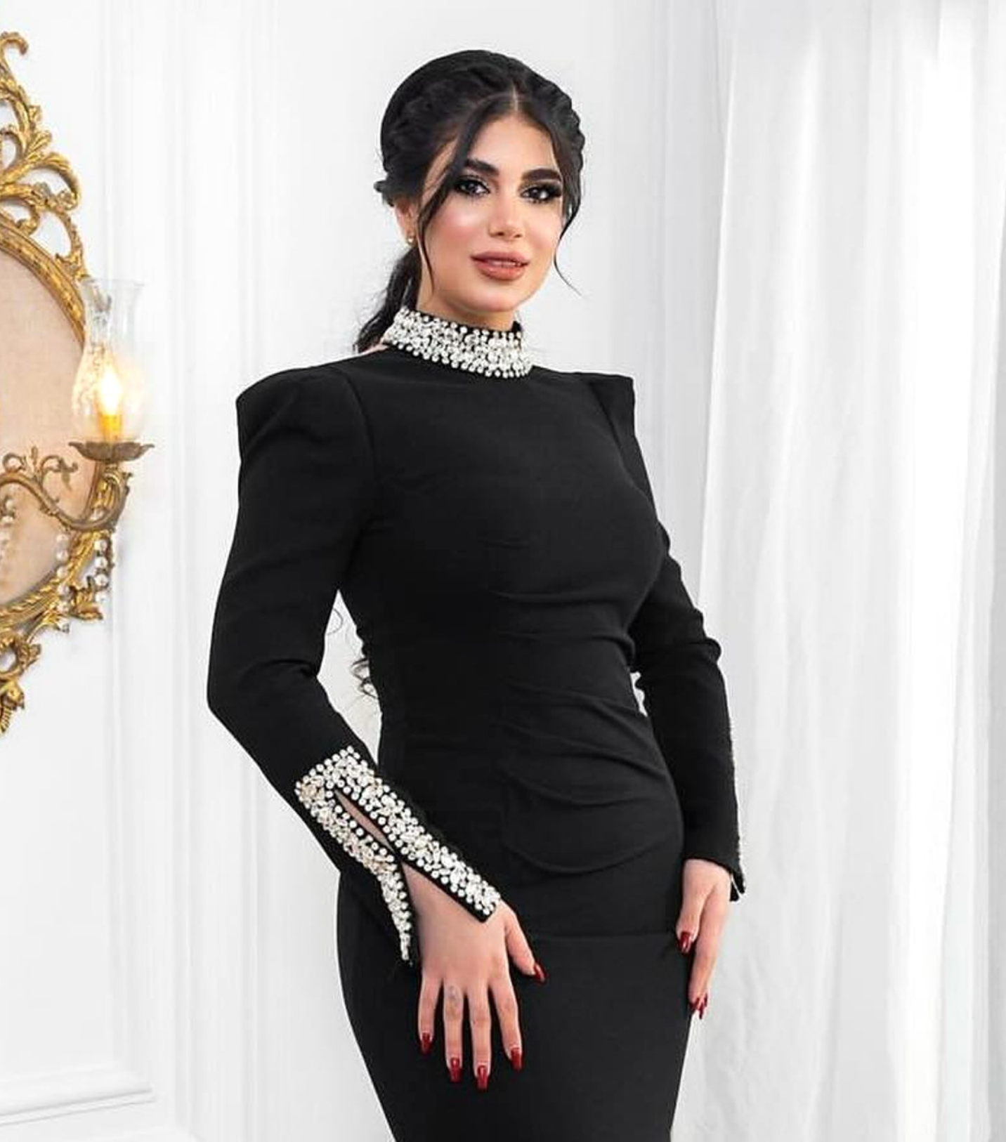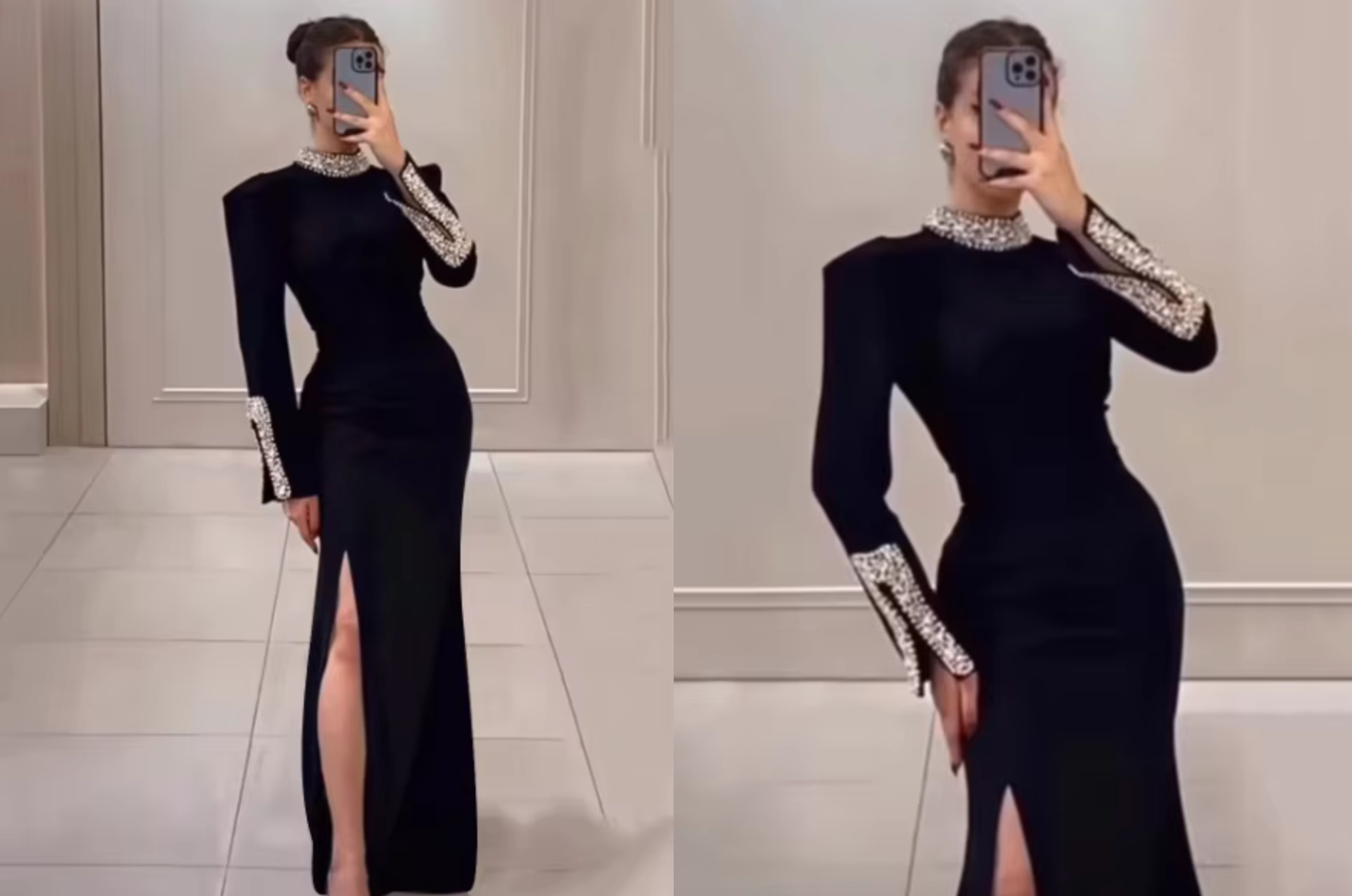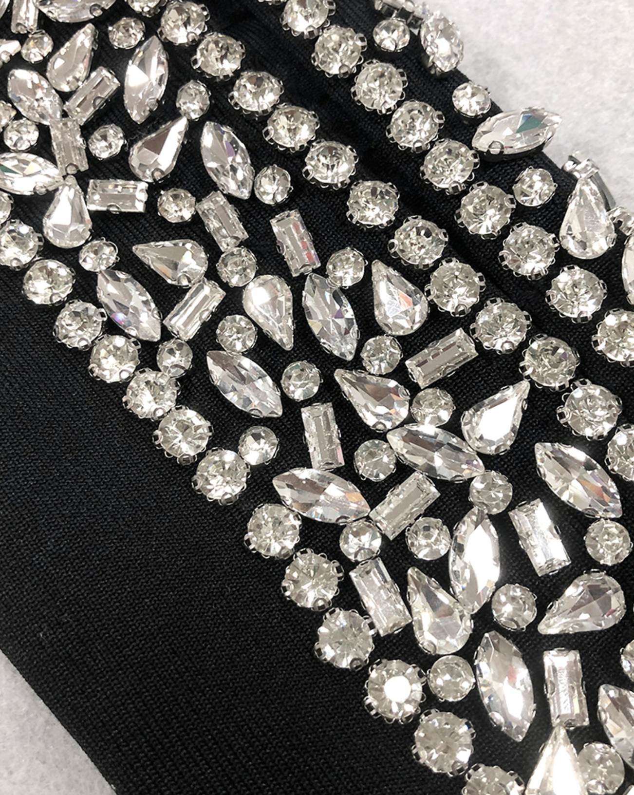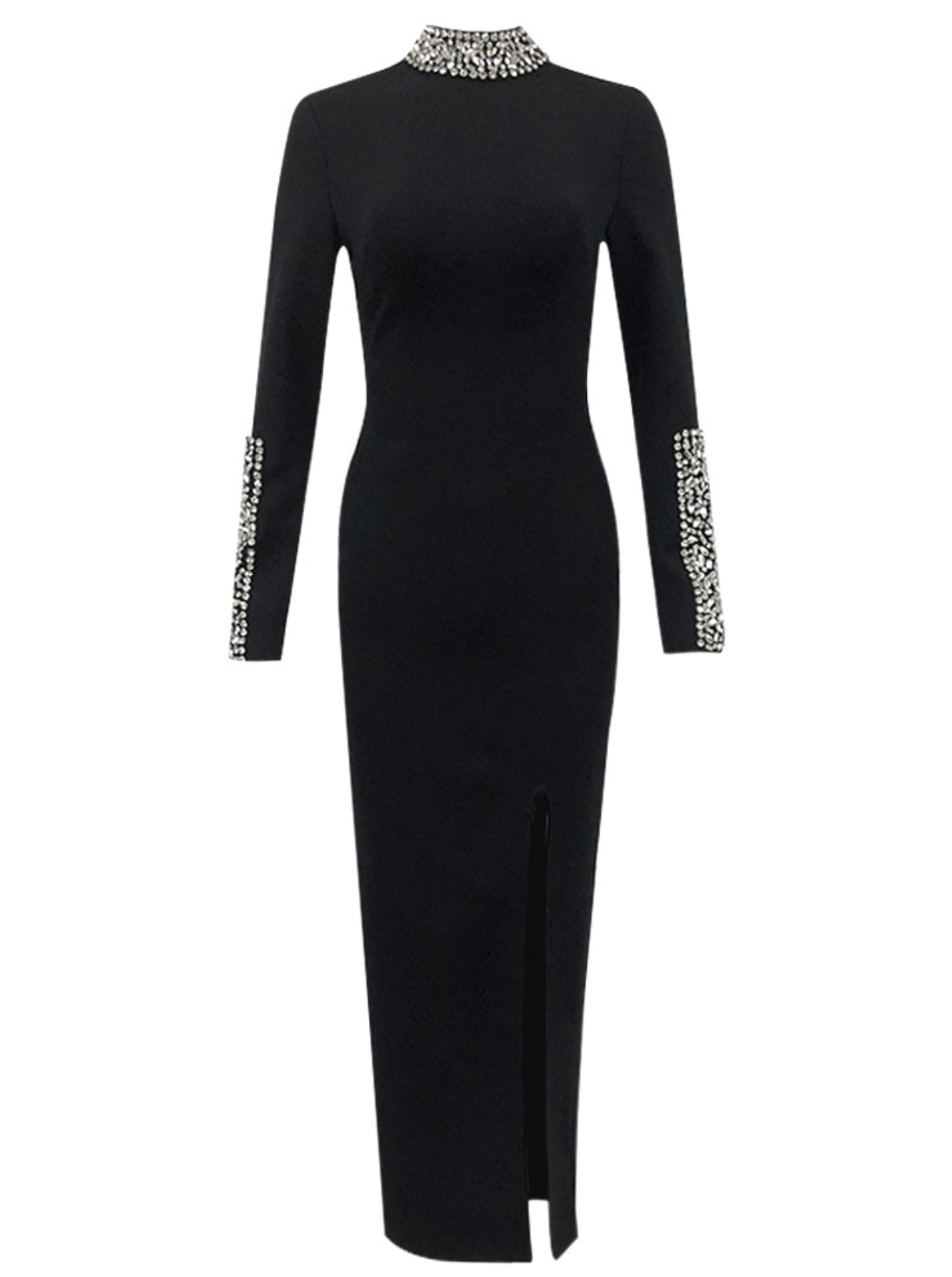 This stunning black The Rittenhouse Dress features long sleeves and a sexy split, adorned with luxurious diamonds for a touch of glamour. Perfect for a celebrity cocktail party or a night out, this bandage gown will hug your curves in all the right places.