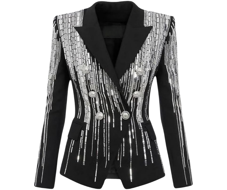 This double-breasted metal sheet blazer with beads features intricate sequins that add a touch of sparkle to your outfit, making it perfect for special occasions or adding a touch of elegance to your everyday look. The double-breasted design and slim fit silhouette create a flattering and stylish appearance, while the heavy industry beads and metal sheet detailing add a unique and edgy touch. Stay warm and fashionable with this must-have jacket that effortlessly combines style and sophistication.