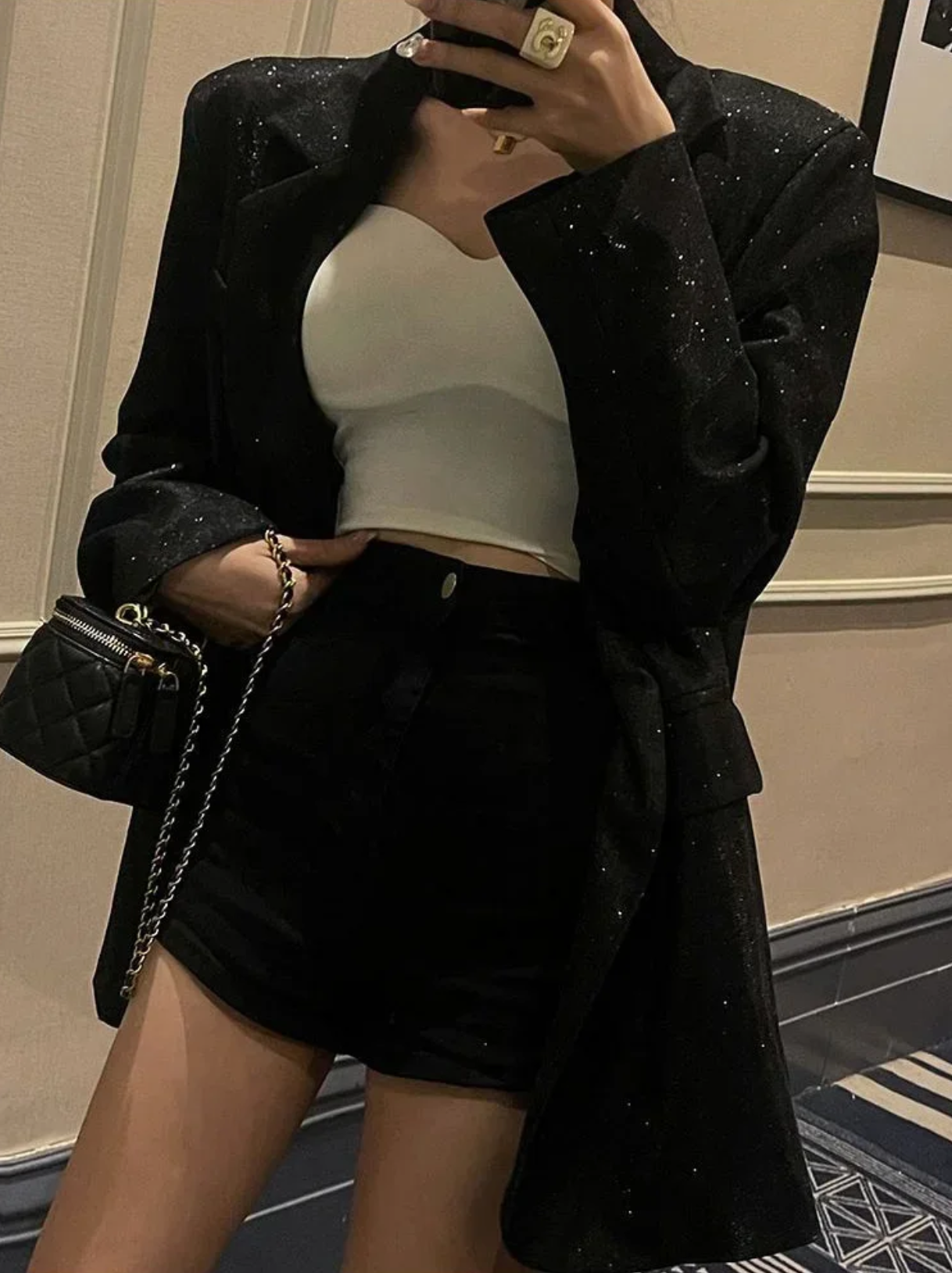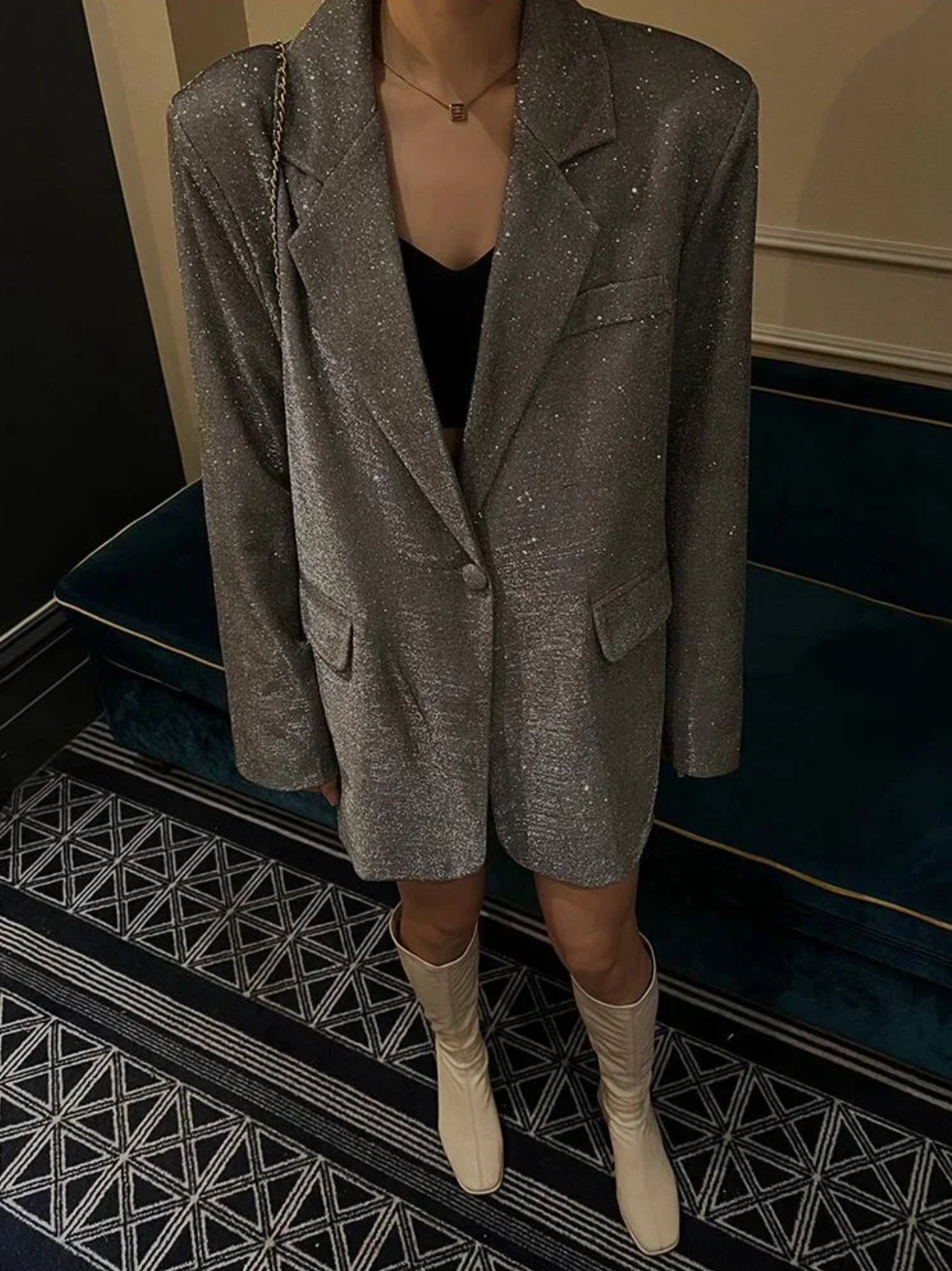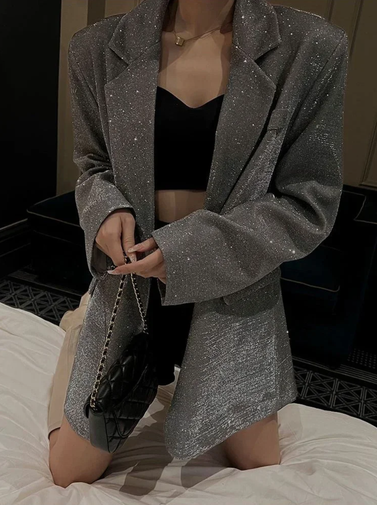 Introducing the Chambre de La Paix Blazer, a luxurious and elegant addition to your wardrobe. Featuring a sequin glitter lapel, this blazer exudes sophistication and exclusivity. With its long sleeves, fashion pockets, and sparkling coat, it's the perfect statement piece for any occasion. Elevate your style with this exquisite women's suit outwear.