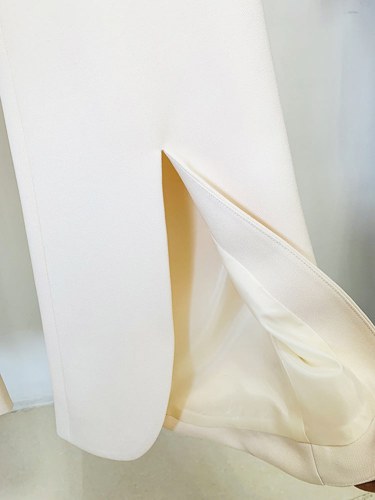 This elegant white suit and pants set is a perfect addition to any wardrobe, featuring a beautiful arc-cut diamond buckle on the heart-shaped cloth cover including heart-shaped buttons on both blazer and pants. This Goods Stars design adds a touch of sophistication to this work pant suit, making it suitable for various formal occasions.