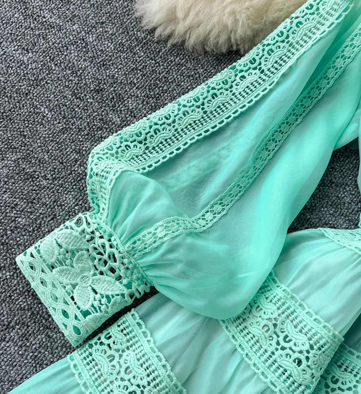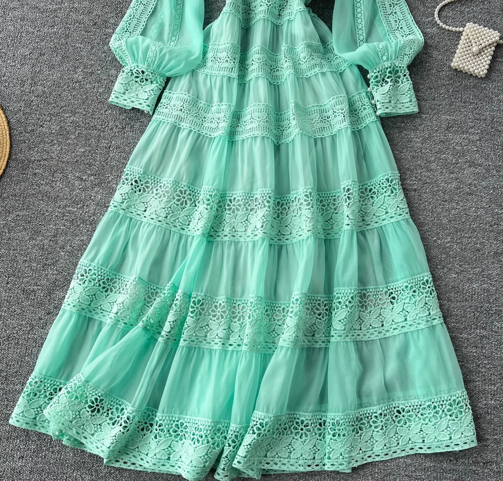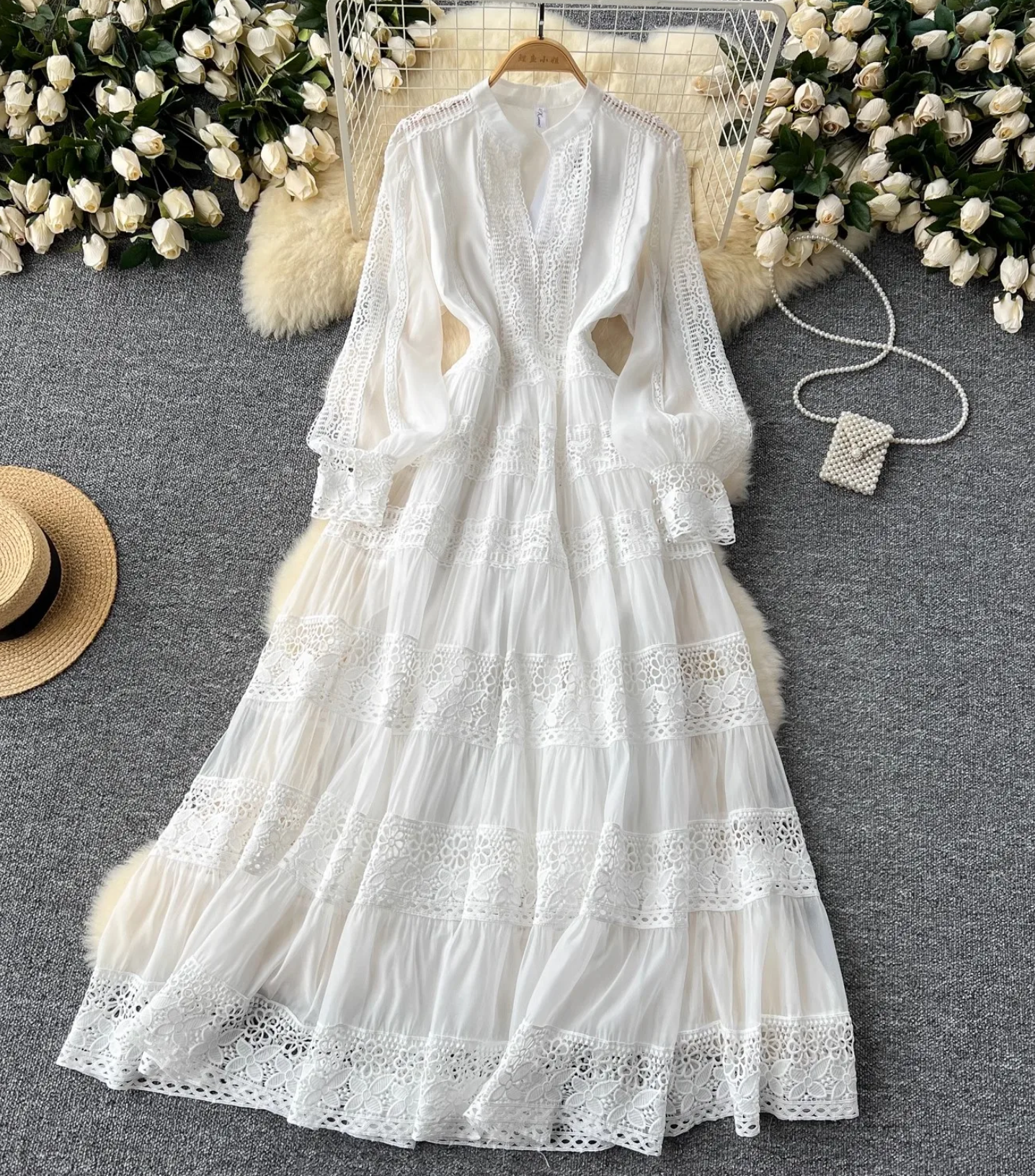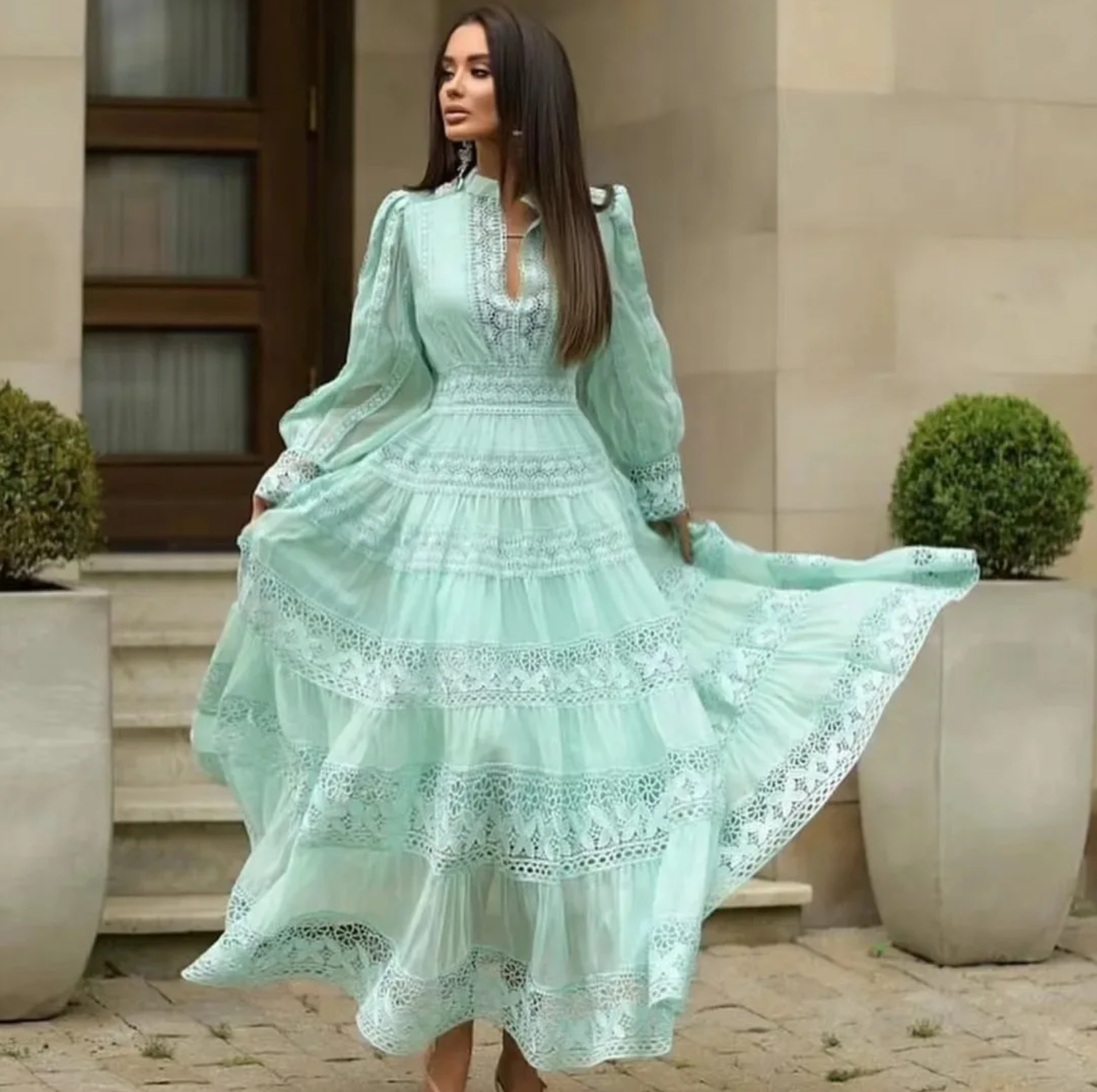 Experience elegance and luxury with the Feltrinelli Spring Dress. This spring dress features intricate hollow out embroidery and lace splicing, creating a timeless and sophisticated look. The V-neck and lantern sleeve add a touch of femininity, while the embroidery adds a touch of glamour. Perfect for any evening party or special occasion.