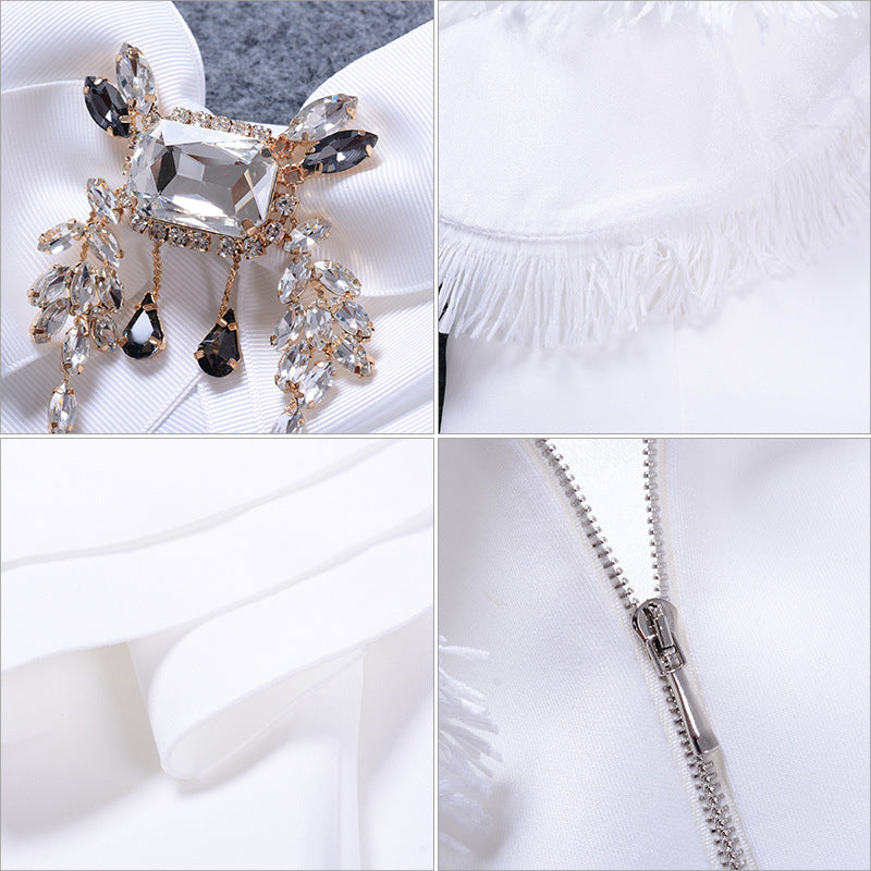 This elegant white Flying Sleeves Mini Dress dress features stylish flying sleeves and a metal badge detail, making it a perfect choice for a party, evening or prom night. The short sleeve design and mini length add a touch of sophistication to this women's clothing piece. Made from high-quality materials, the mini dress is not only fashionable but also comfortable to wear. The classic white color makes it versatile for various occasions, while the unique details set it apart from other dresses. Perfect for those looking to make a statement at their next special event.