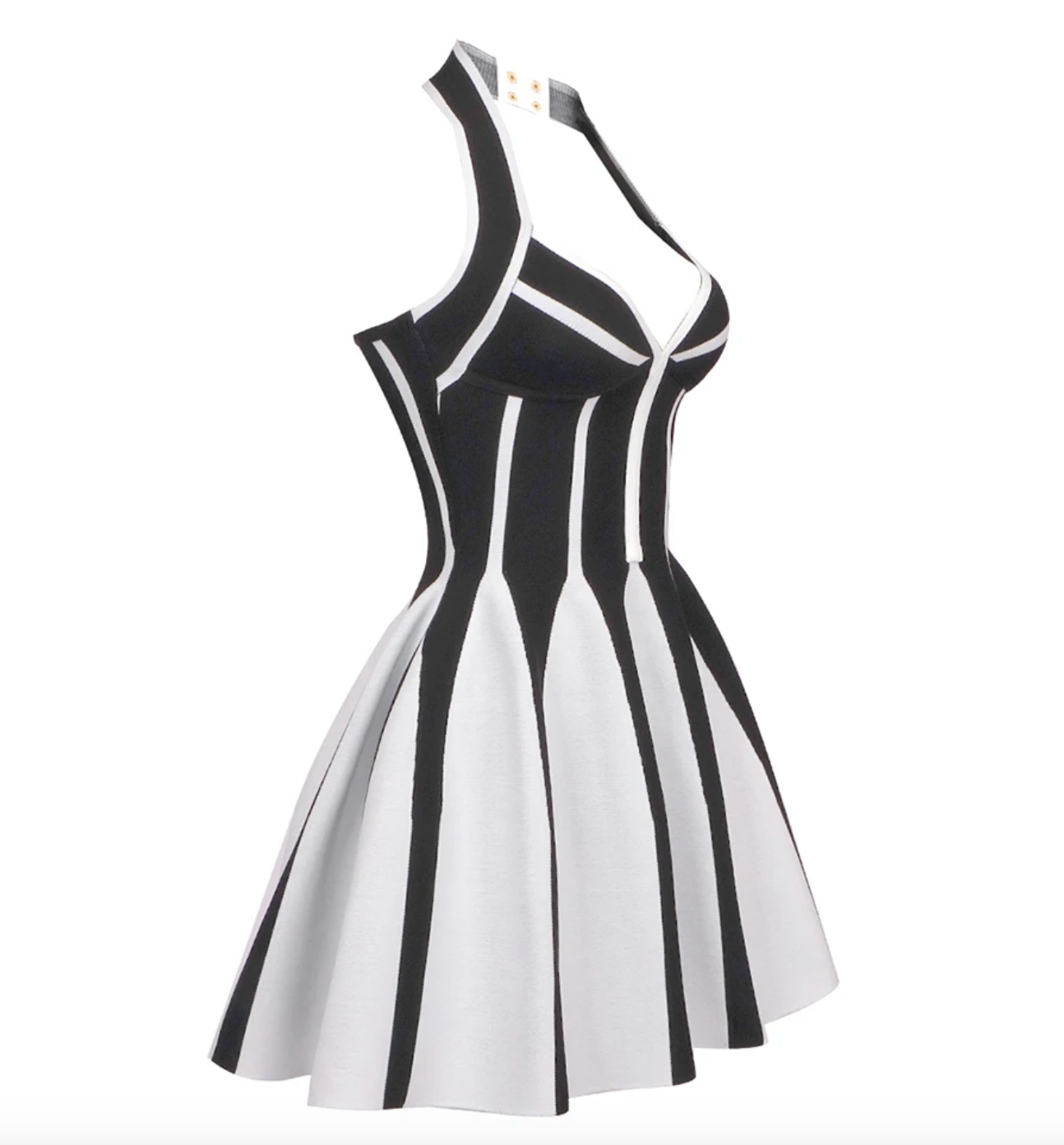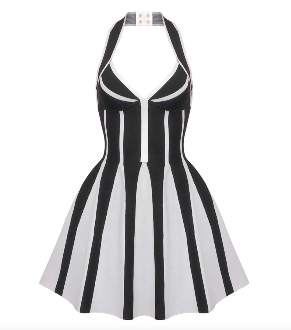 Elevate your style with the Grenada Mini Dress. This sexy sleeveless dress features a halter neck design and black and white stripes for a sophisticated look. The backless design and pleated knit material add a touch of elegance to this cocktail party dress. Dress to impress with this exclusive piece.