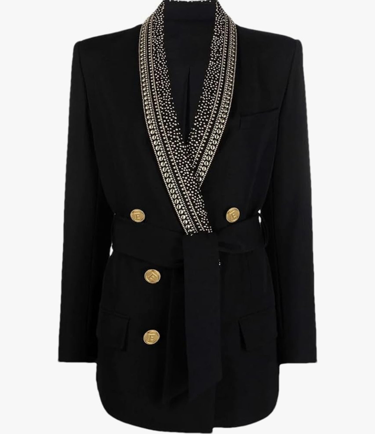 Our sophisticated black dress with full sleeves has a touch of elegance. This impeccably tailored blazer dress features a rich black color, complemented by a matching collar that adds a subtle contrast. To elevate its style, we have adorned the collar with a delicate gold accent, adding a touch of glamour to this classic piece. The V-Neck double beaded blazer dress is crafted with attention to detail and designed for versatility, this dress is perfect for both formal occasions and adding a polished touch to your everyday attire.