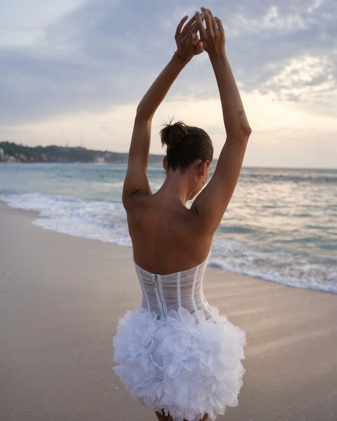 Step into the spotlight with the Hilo Party Dress, a daring short bridal gown designed to captivate. Crafted from sheer pleated tulle, this mini-length dress blends playful elegance with bold charm, perfect for beach weddings, holiday celebrations, or unforgettable photoshoots. Embrace your adventurous side and make every moment a statement in this effortlessly chic and flirty dress.