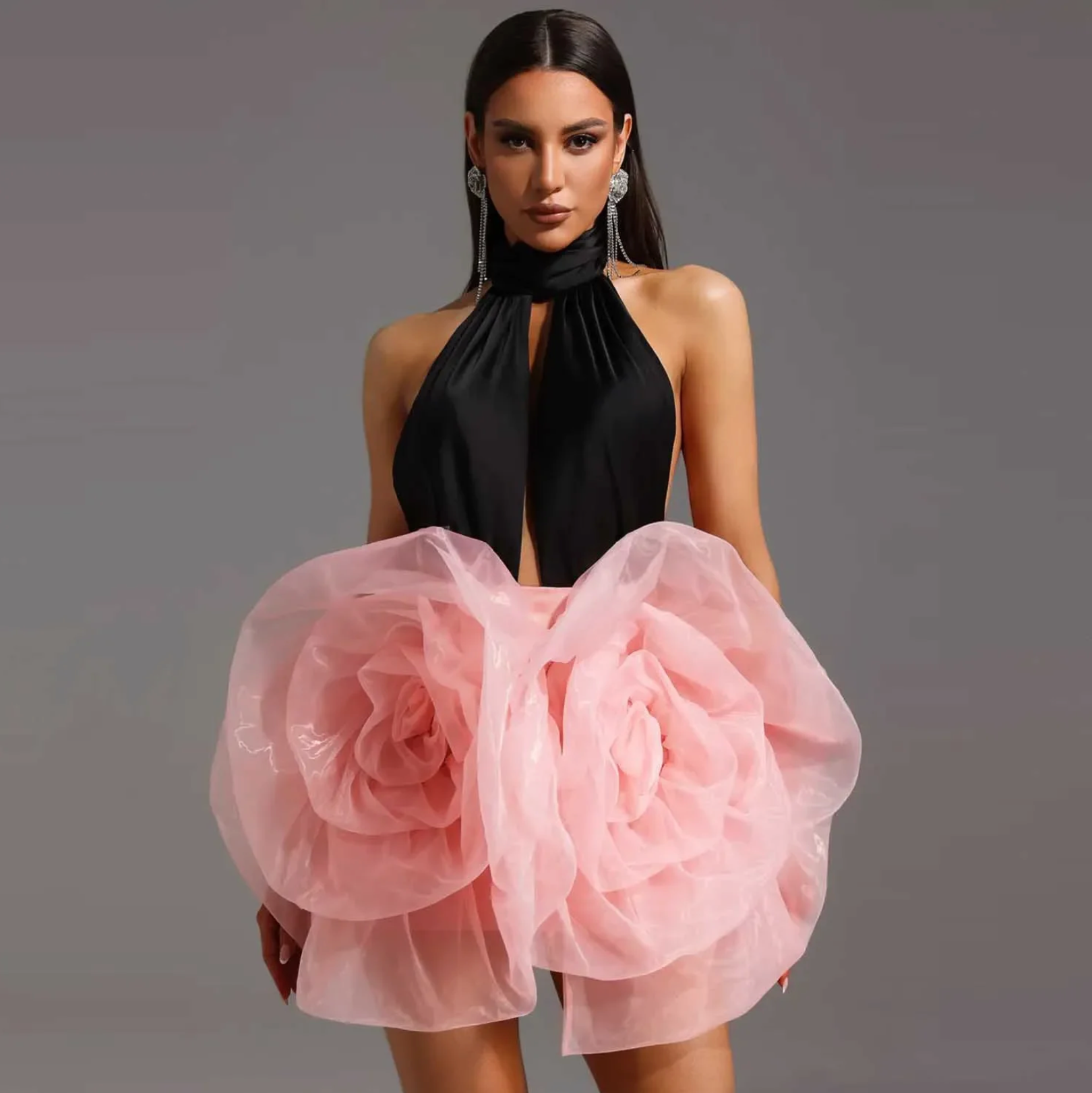 Unleash your inner temptress in our Medley Mini dress. This provocative cocktail number features an alluring halter neckline and daring backless design that demands attention. Luxurious satin fabric hugs your curves while 3D floral ruffles add dramatic dimension. The sleeveless A-line silhouette with natural waistline flatters every figure, making this above-the-knee showstopper perfect for turning heads at your next party or night out.
