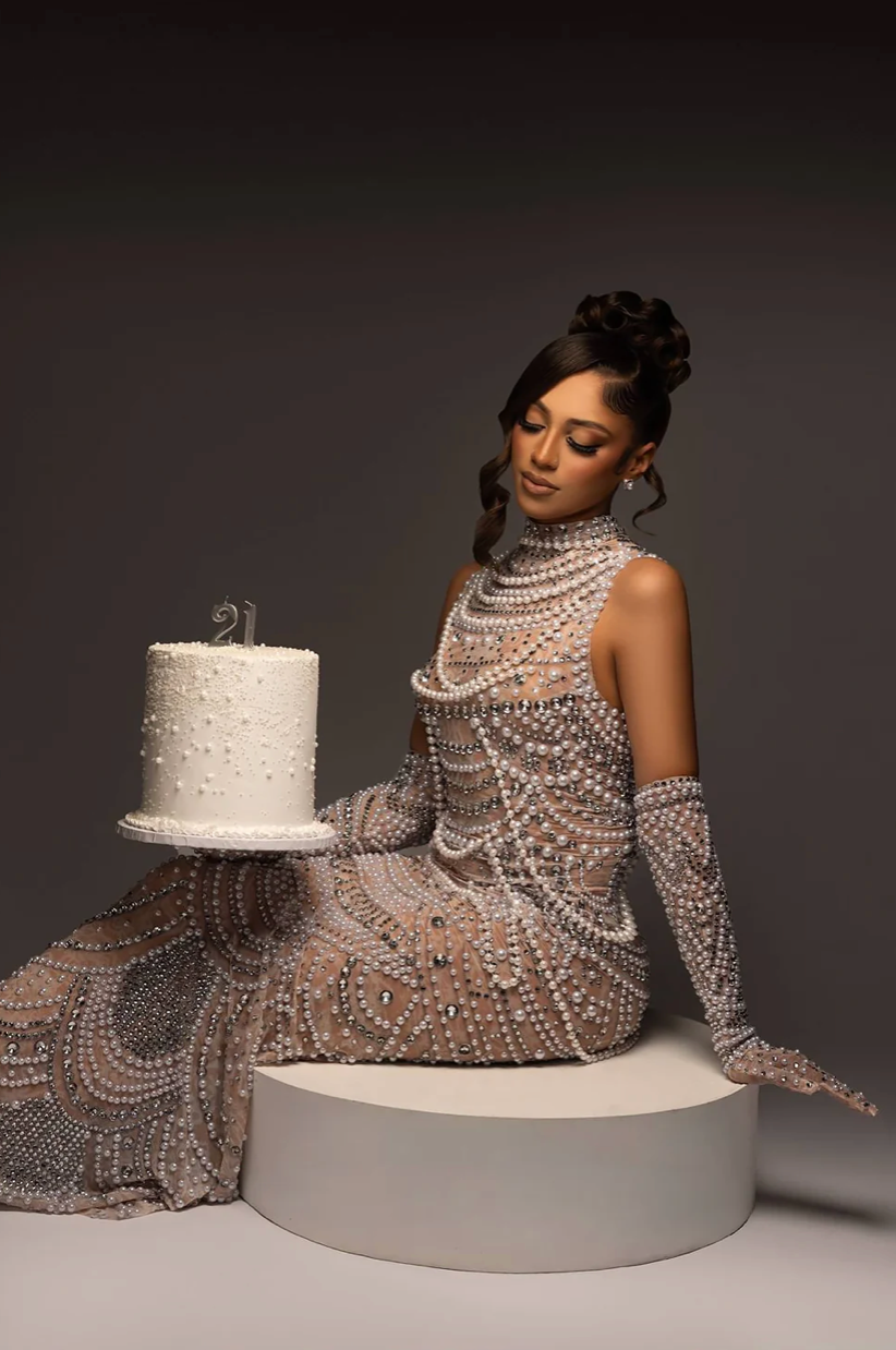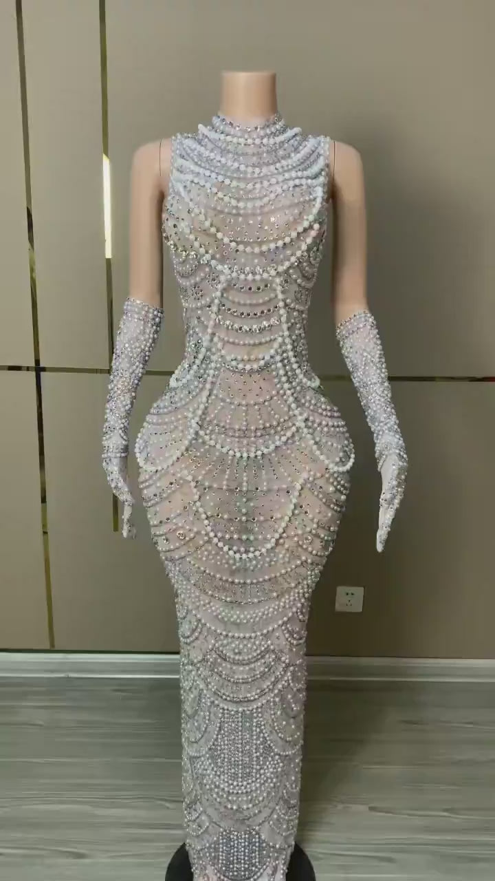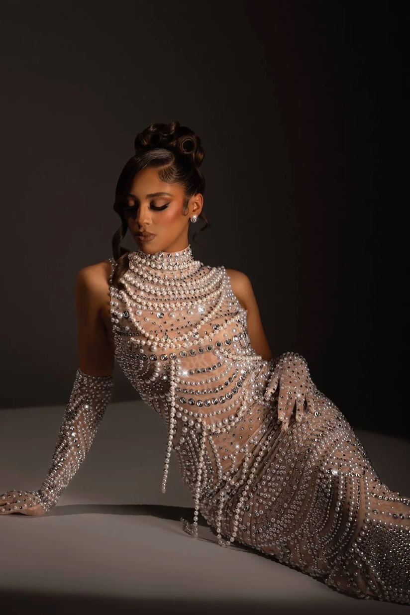 Step into bold elegance with the Sulina French Gown. This daring cocktail dress showcases dazzling rhinestones and premium fabric, creating a striking and exclusive statement. Crafted with intricate beading and pearls, its trumpet silhouette and sheer, sleeveless design exude confidence and allure. Make a memorable entrance and own the spotlight with this captivating piece.