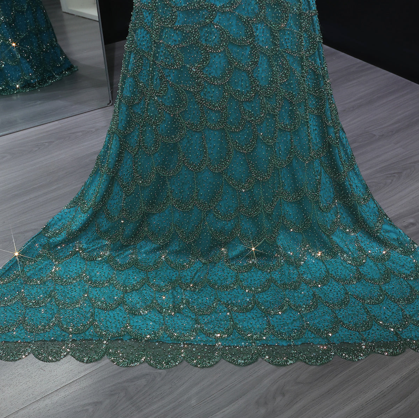 Make a bold statement in the Oceana Gown, a daring strapless mermaid silhouette crafted from luxurious tulle, satin, and polyester. This elegant emerald green dress features intricate beading and crystal appliqués that catch the light with every move. Designed sleeveless with a sweeping train, it combines sexy allure with sophisticated glamour—perfect for weddings, formal Arabic parties, or any occasion where you want to captivate the room.