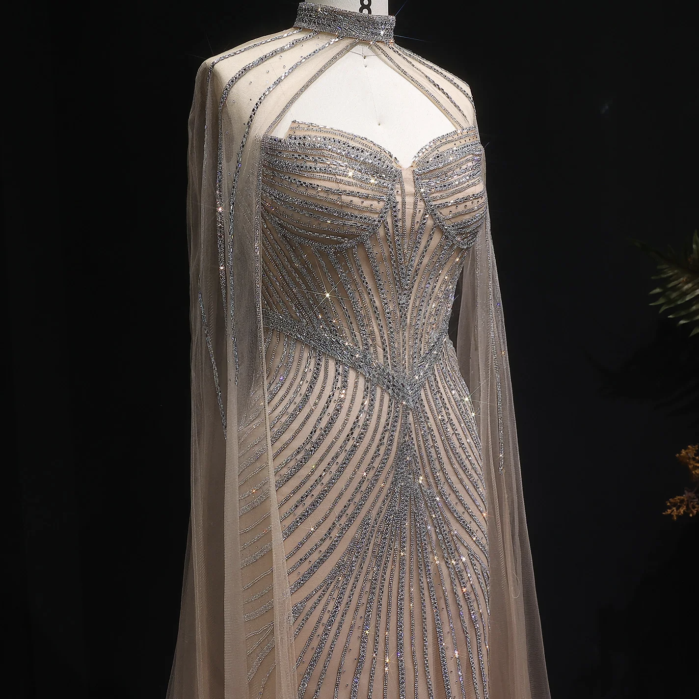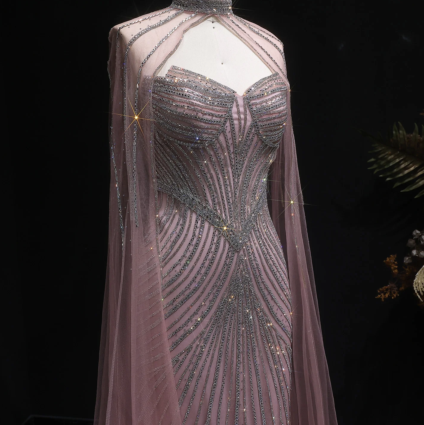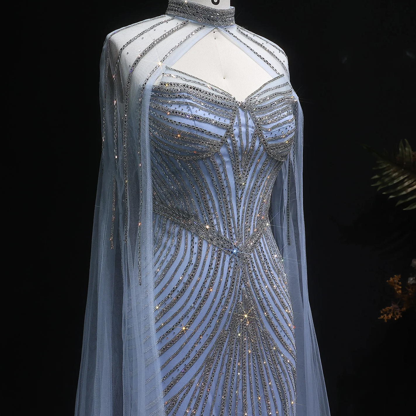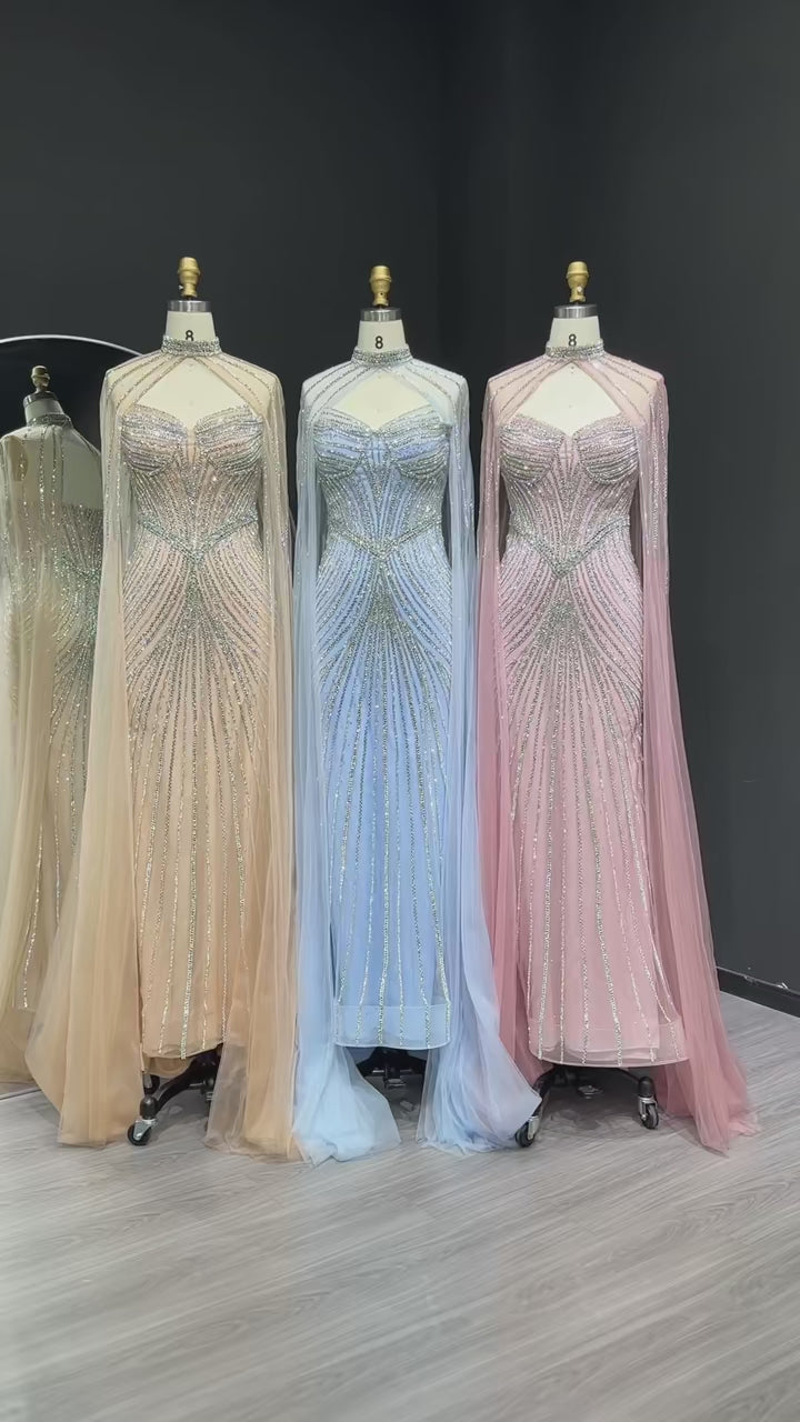 Dive into allure with the Pegasus Gown, a dazzling mermaid silhouette crafted from ethereal blue tulle. Beaded crystals catch the light, accentuating the bold sweep train and dramatic cape sleeves. This custom evening dress redefines elegance, commanding attention at weddings or parties with its sparkling detail and fearless design. Ready to turn every entrance into a grand statement?