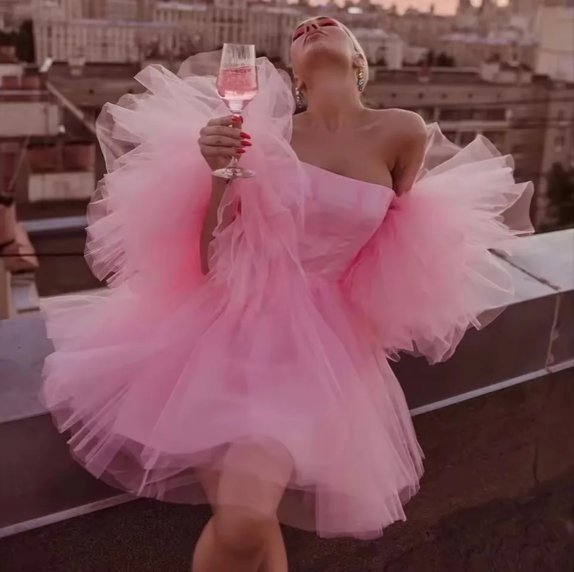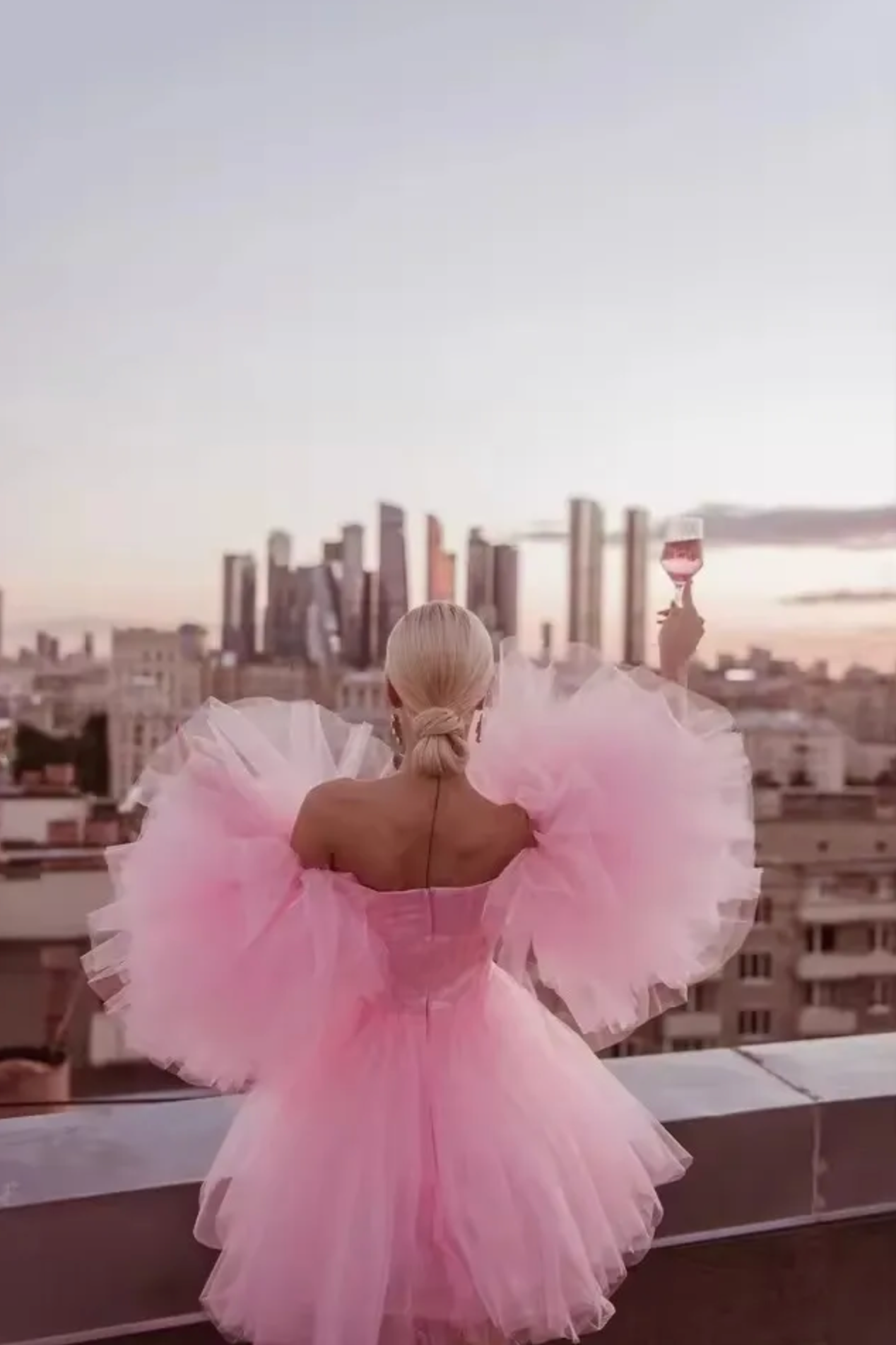 Step into the spotlight with the Pinsker Mini, a daring prom and party dress designed to turn heads. Featuring a strapless corset top and puff sleeves, this above-the-knee dress combines playful tulle fabric with an empire waistline for a flattering silhouette. Perfect for birthdays and formal events, its bold design ensures you’ll make a memorable entrance.