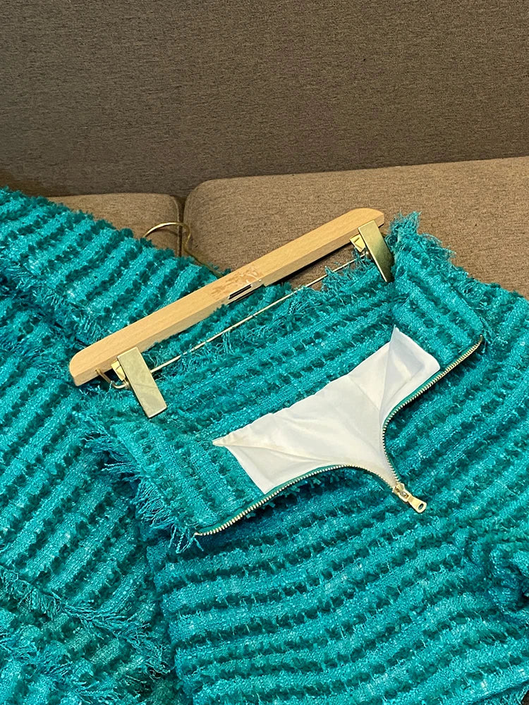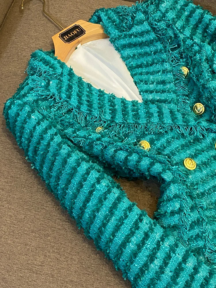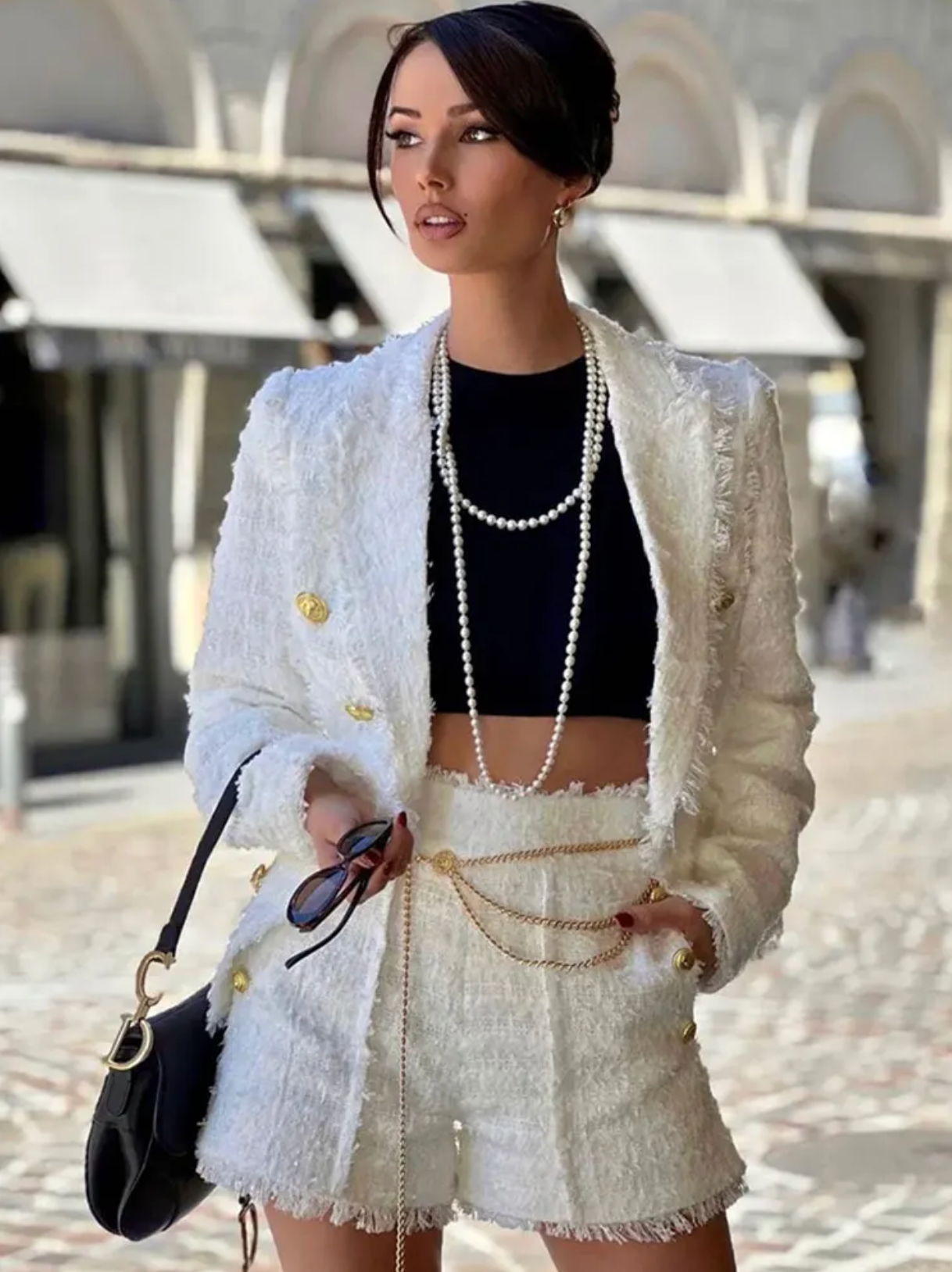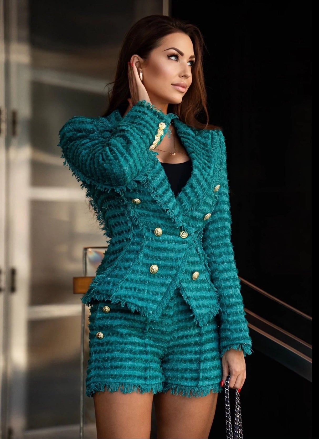 Get ready to turn heads and feel like a boss in our Caprice Two-Piece Suit. Made with retro tweed fabric and featuring intricate tassel details, this suit will add a touch of sophistication to your office wardrobe. The double-breasted blazer and wide leg shorts will give you a fitted and polished look that is perfect for any work setting. Elevate your style with this 2-piece suit.