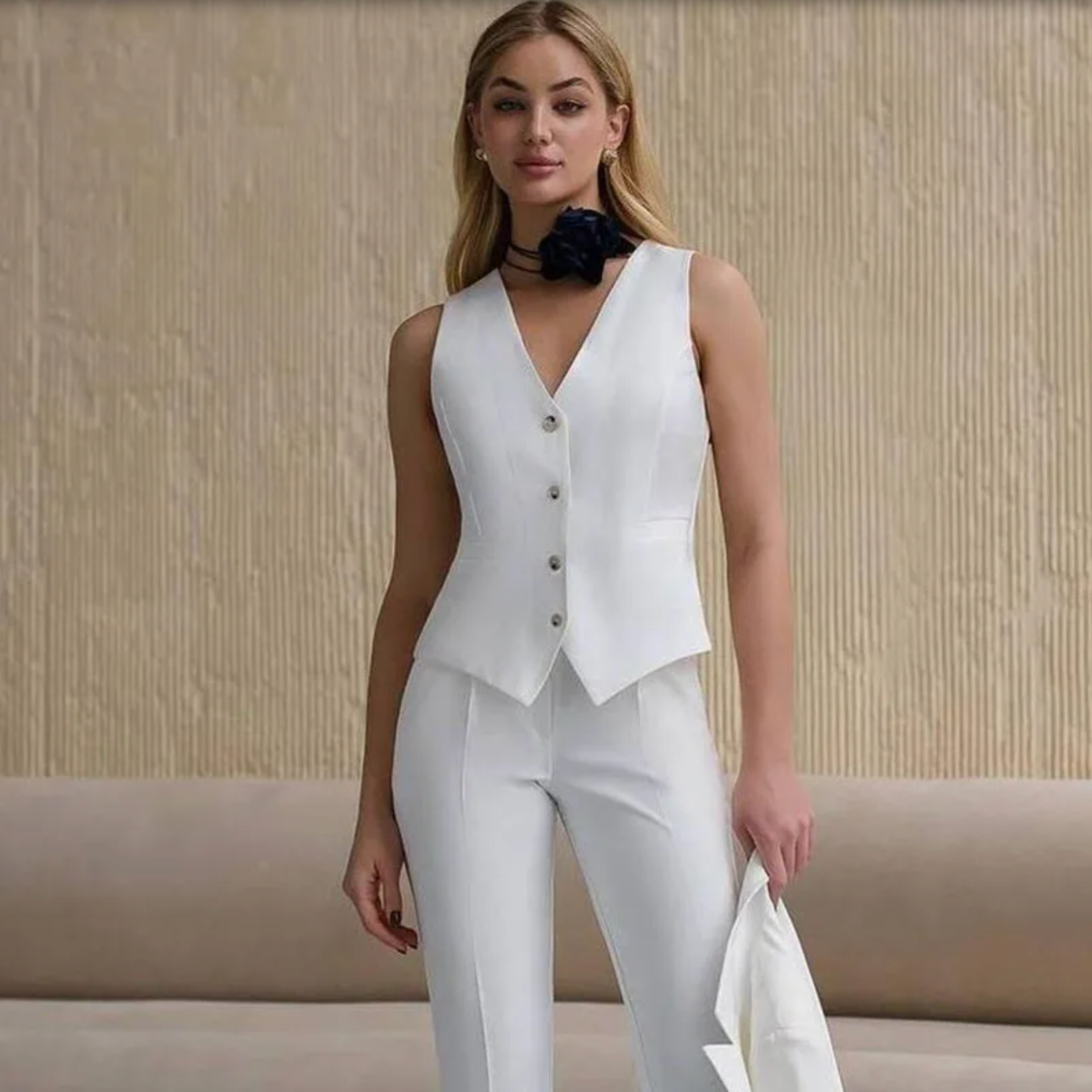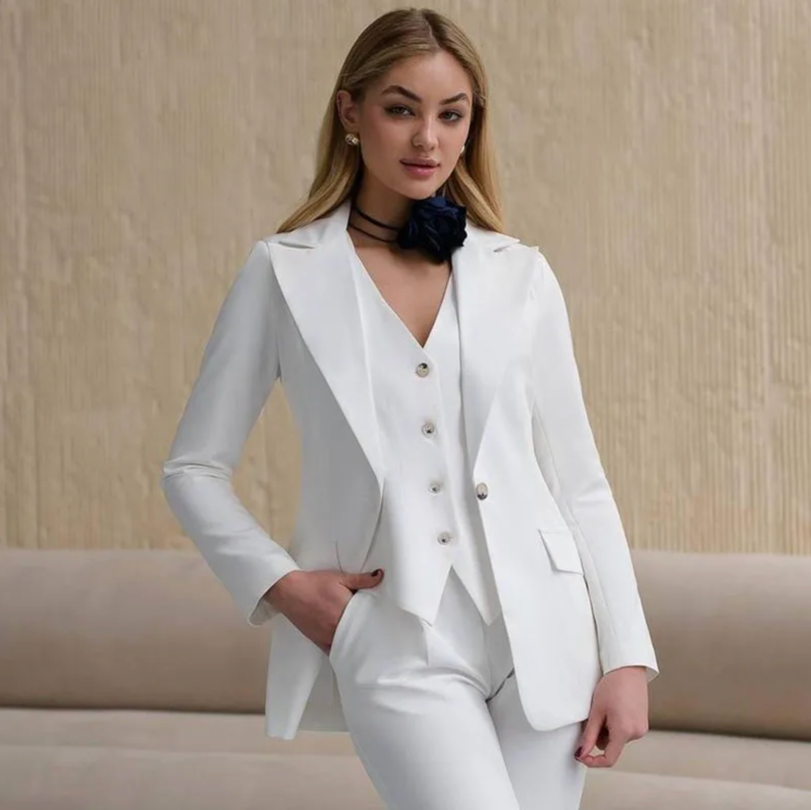 Transform your executive presence with our Santa Croce Three Piece Suit Set – a bold statement of power dressing that refuses to be ignored. This audacious ensemble marries a sharp one-button jacket with perfectly tailored pants and a statement vest, creating a silhouette that commands attention. Daringly structured yet undeniably feminine, this suit defies convention while maintaining luxurious refinement.