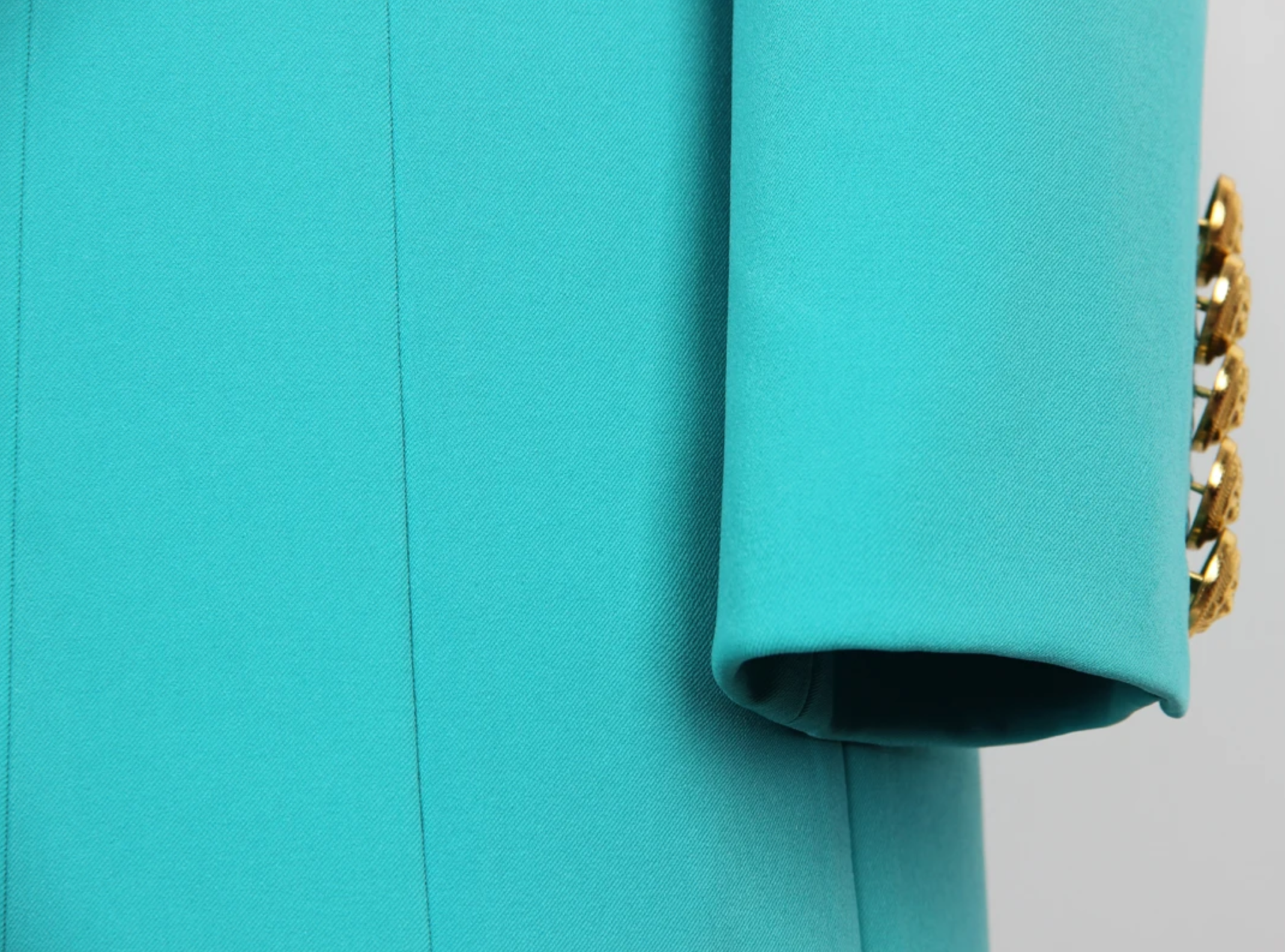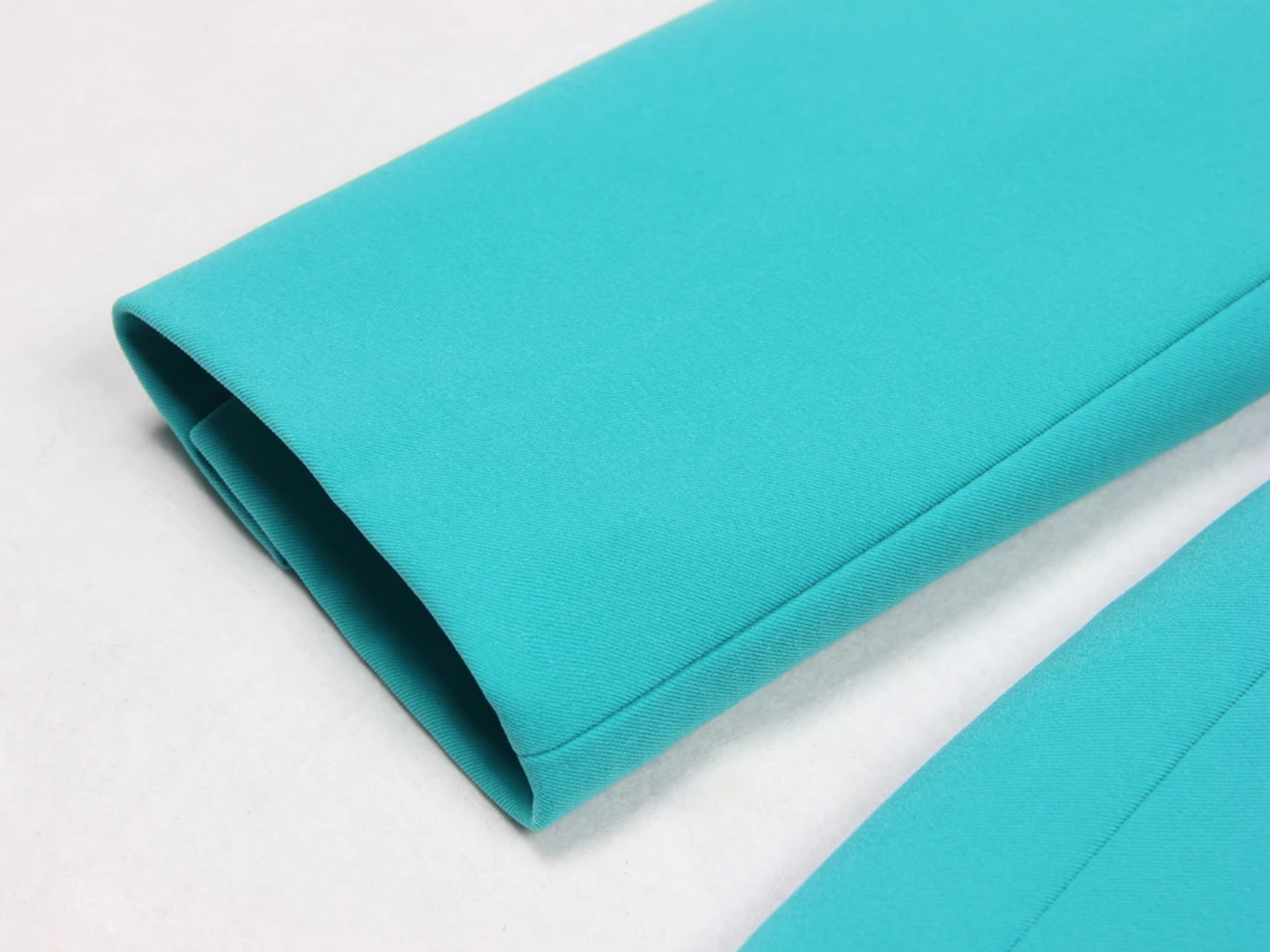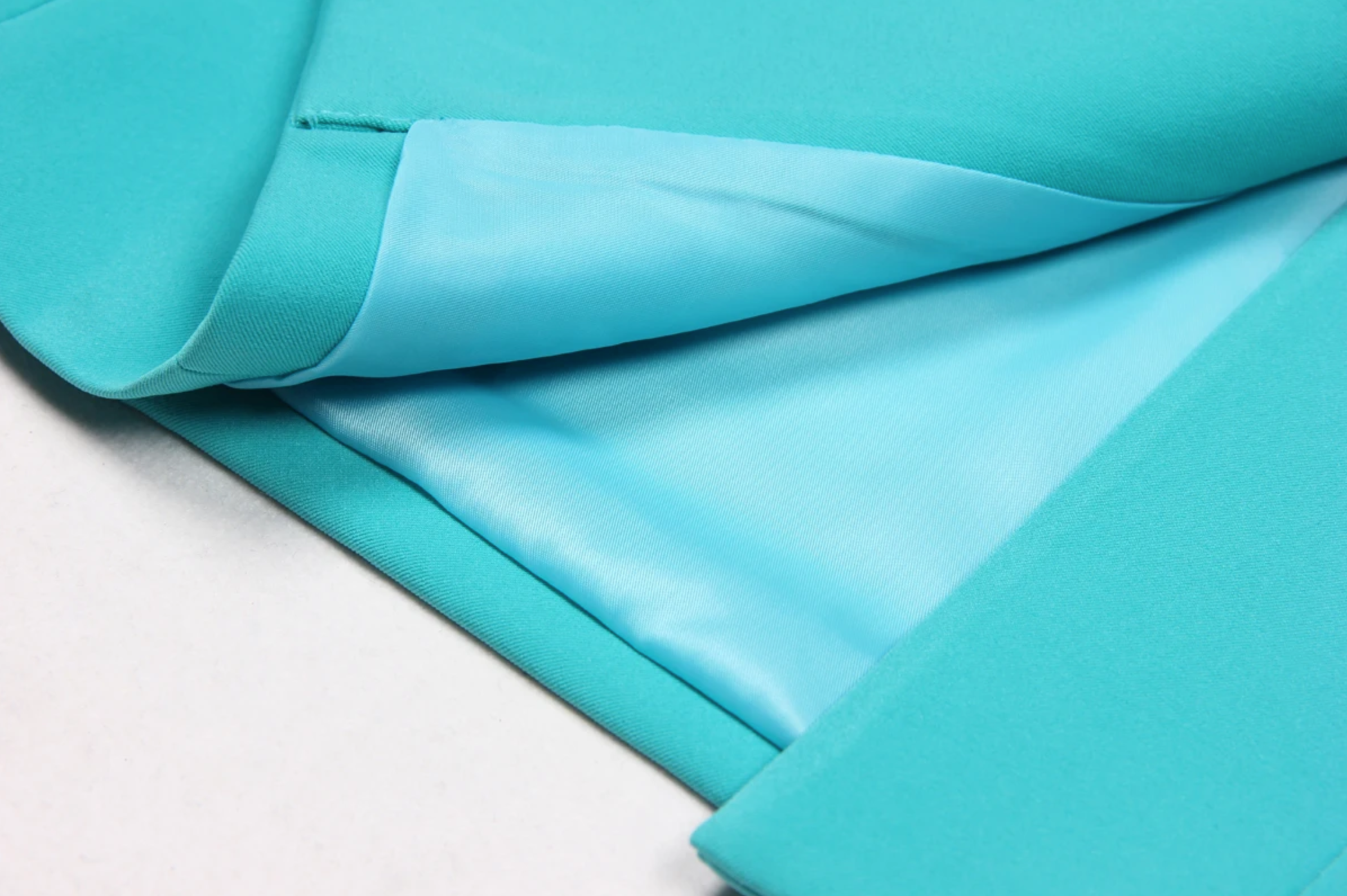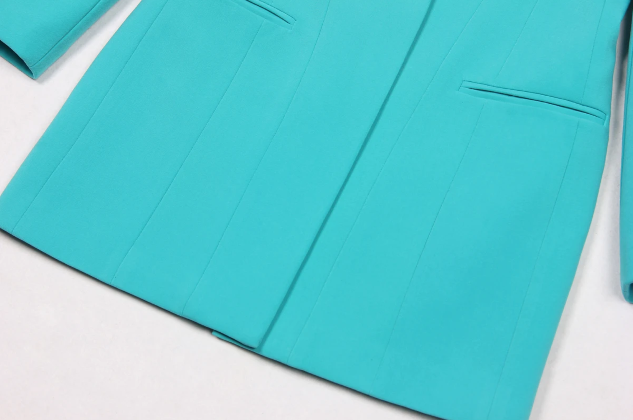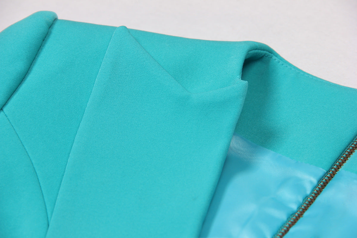 Meet our elegant business blazer dress suit, expertly crafted from a lightweight fabric, perfect for the spring and autumn seasons. This sophisticated ensemble features a high solid color design, complemented by long sleeves, and gold ornate buttons, with a regular fit tailored to enhance the silhouette. Ideal for office wear, this dress exudes professionalism and style, making it a must-have for business-savvy women. Available in Black, Khaki, and Turquoise.
