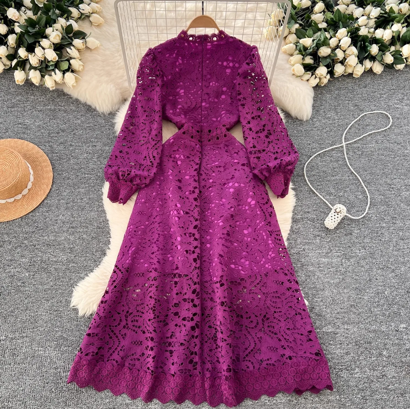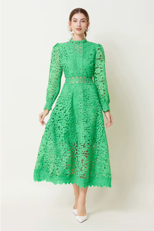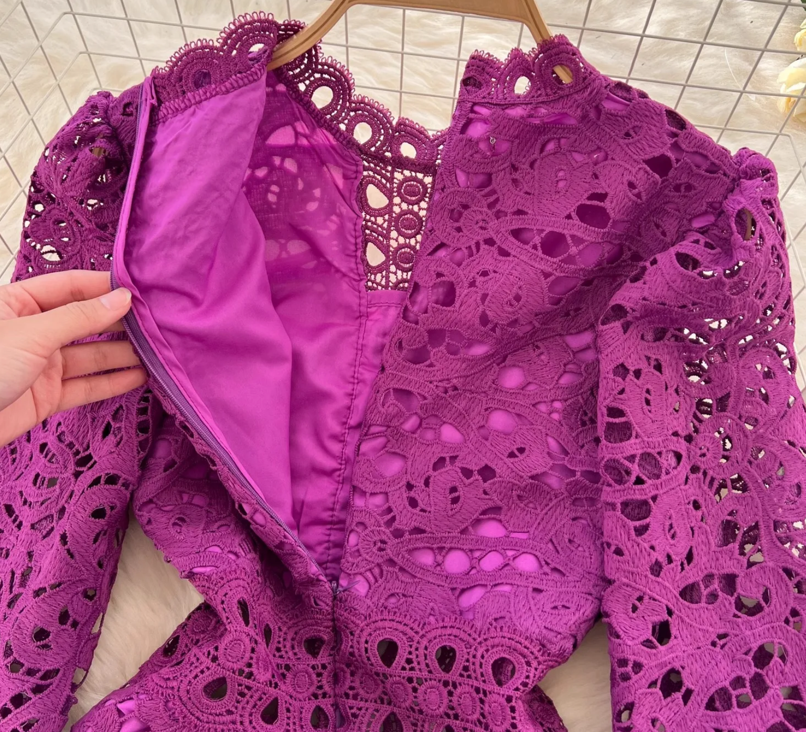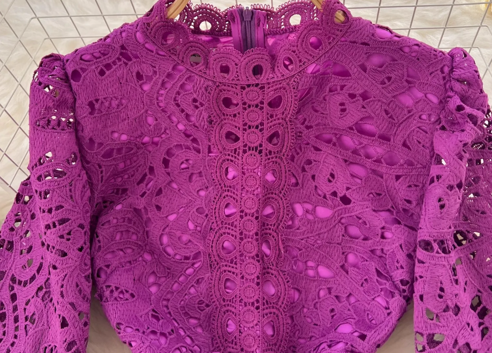 Indulge in the luxurious elegance of our Sun and Sand Crochet Dress. Featuring delicate flower embroidery and intricate lace details, this midi dress exudes sophistication. The lantern sleeves and stand collar add a touch of drama, while the crochet cutouts enhance the overall design. Elevate your style with this exclusive piece.
